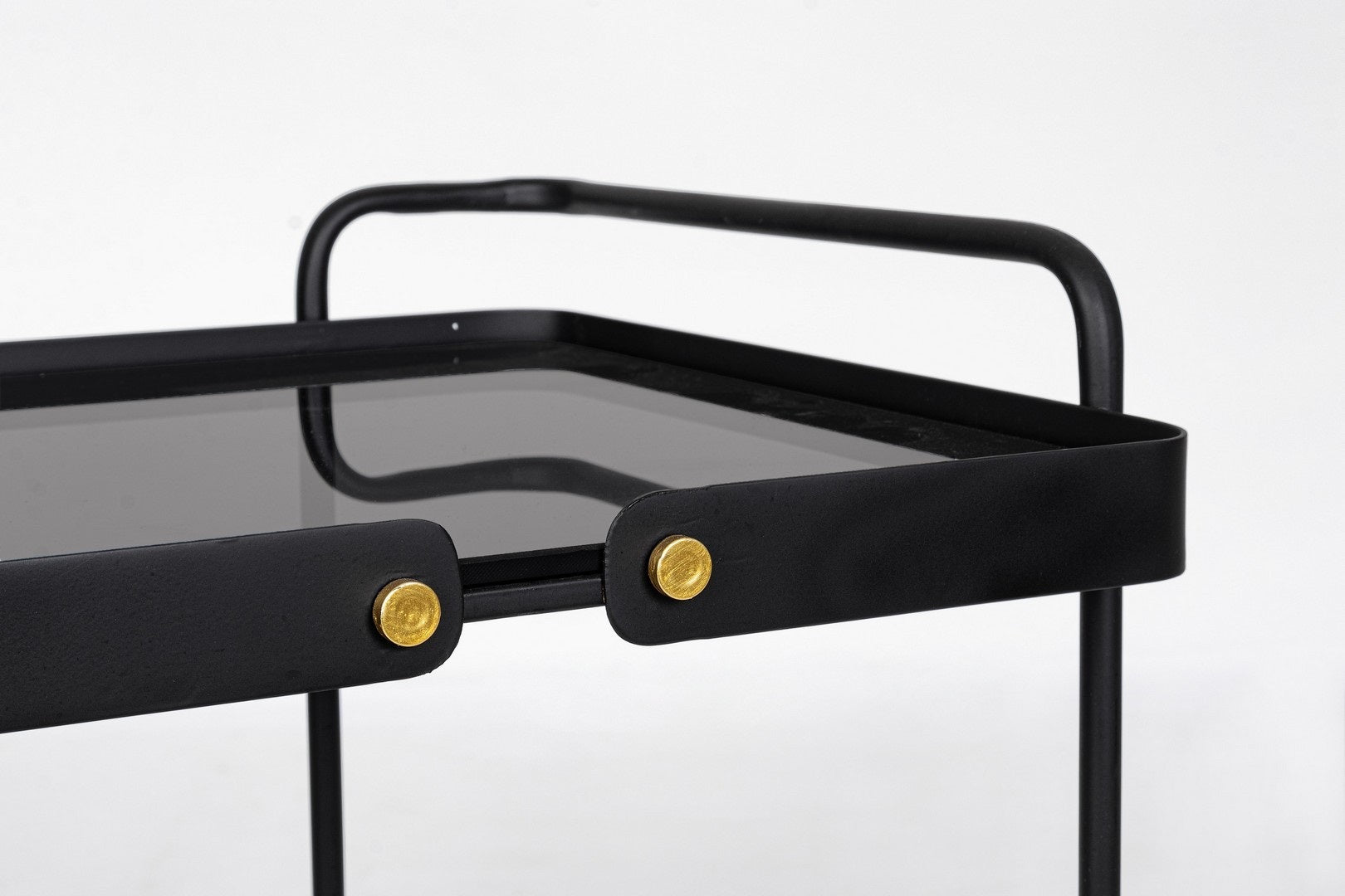 Masuta de bucatarie cu roti, realizata cu cadru din otel vopsit cu pulbere si polite din sticla securizata.