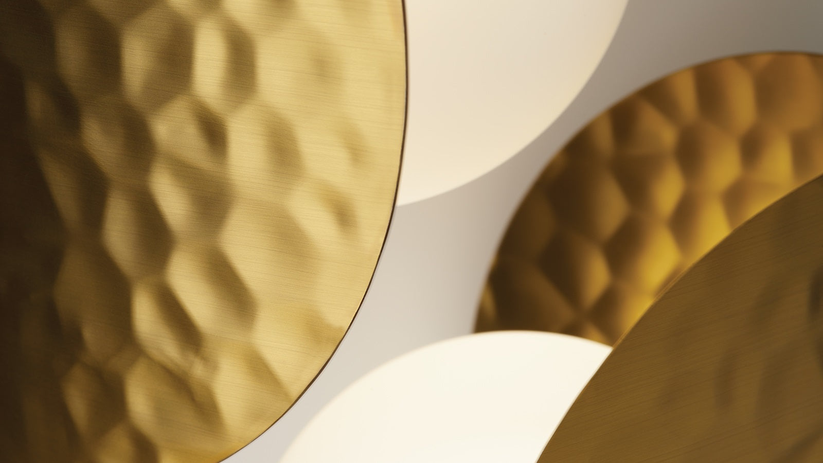 Aplica de perete cu elemente decorative metalice in culoarea alamei, ce seamana cu frunzele plantelor exotice, sursa de lumina este ascunsa sub globul de sticla mata, creand o lumina difuza.