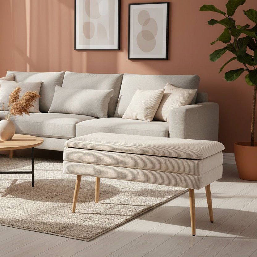 Bancuta cu structura din MDF, picioare din otel cu efect de lemn, tapiterie din poliester.