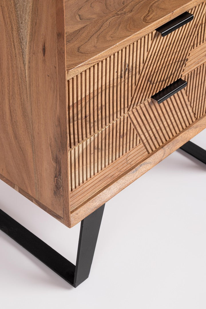 Biblioteca cu structura din lemn de salcam, spatele si partea inferioara a sertarelor din placaj, fetele sertarelor lucrate manual, finisaj acril, manere si picioare din otel.
