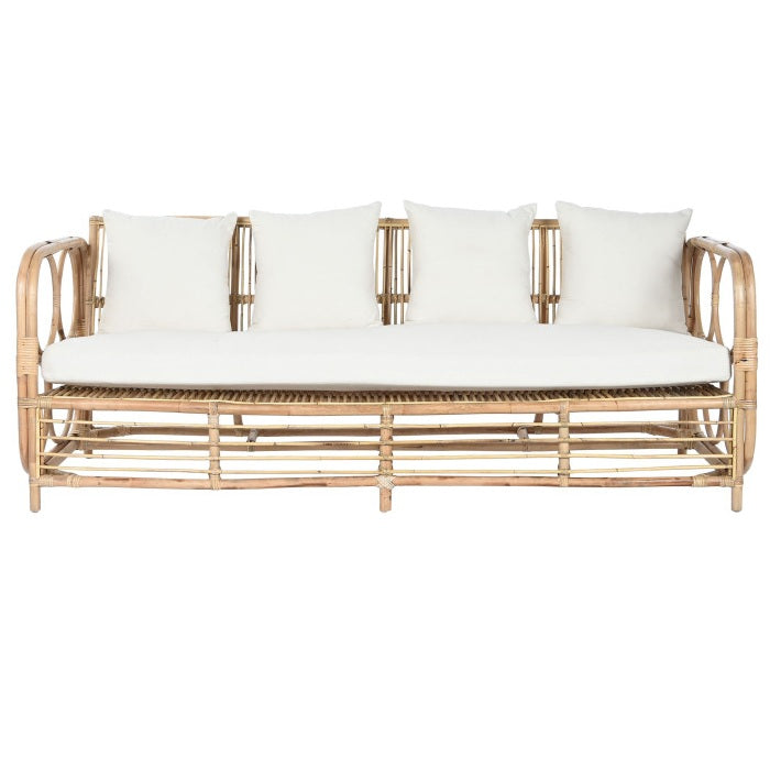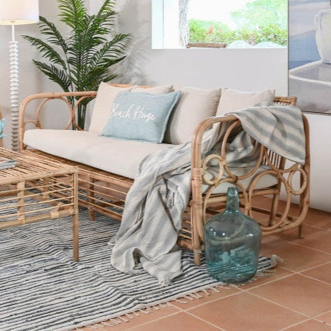 Canapea din ratan in culoare naturala, cu perne din bumbac.