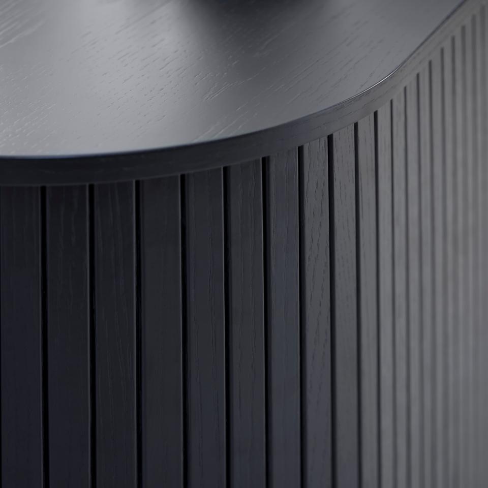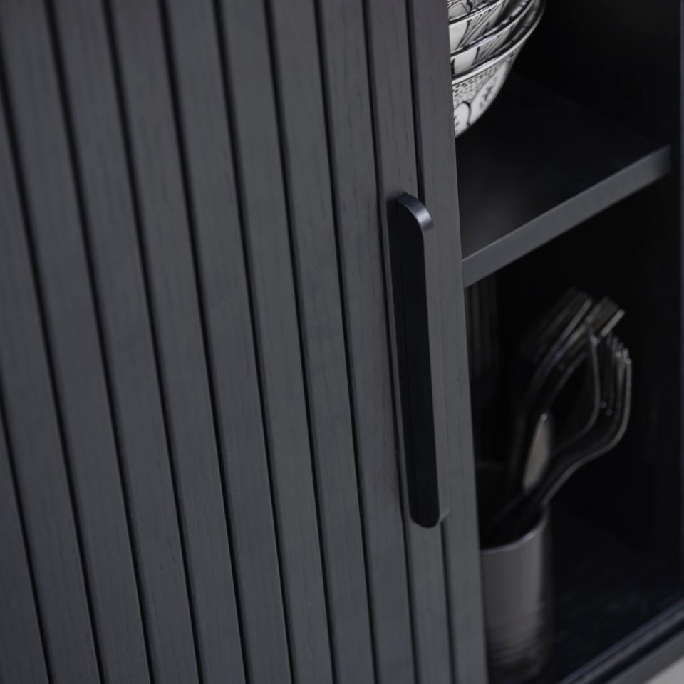 Comoda realizata din MDF cu finisaj de stejar, PAL, melamina si picioare din metal.