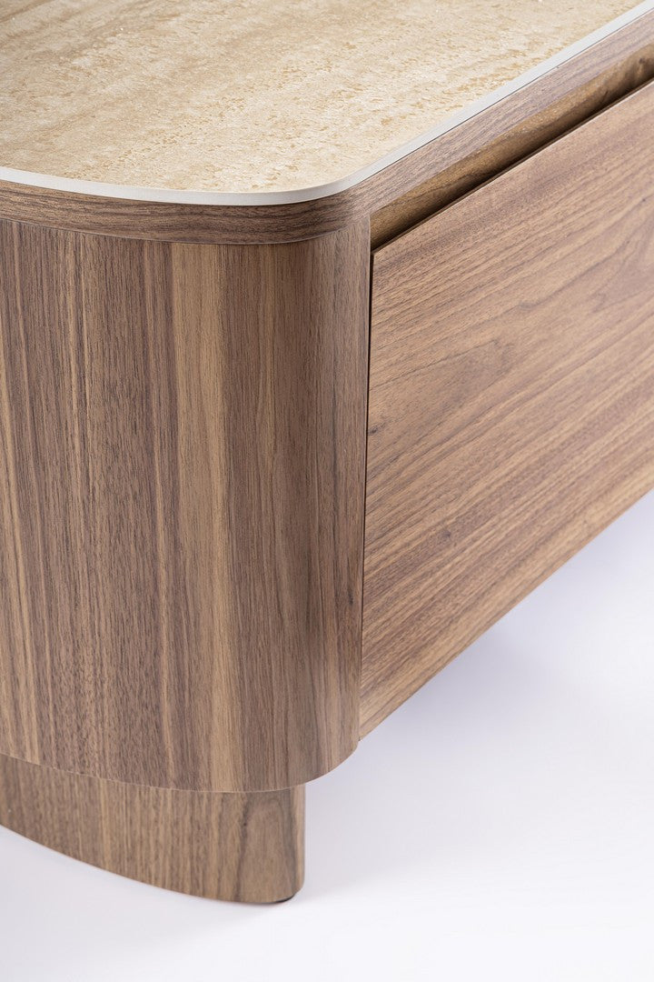 Comoda TV cu structura si picioare din MDF furniruit cu lemn de nuc. Finisaj cu vopsea poliuretanica. Blat din piatra sinterizata cu efect de travertin. Usi si sertare cu inchidere usoara.