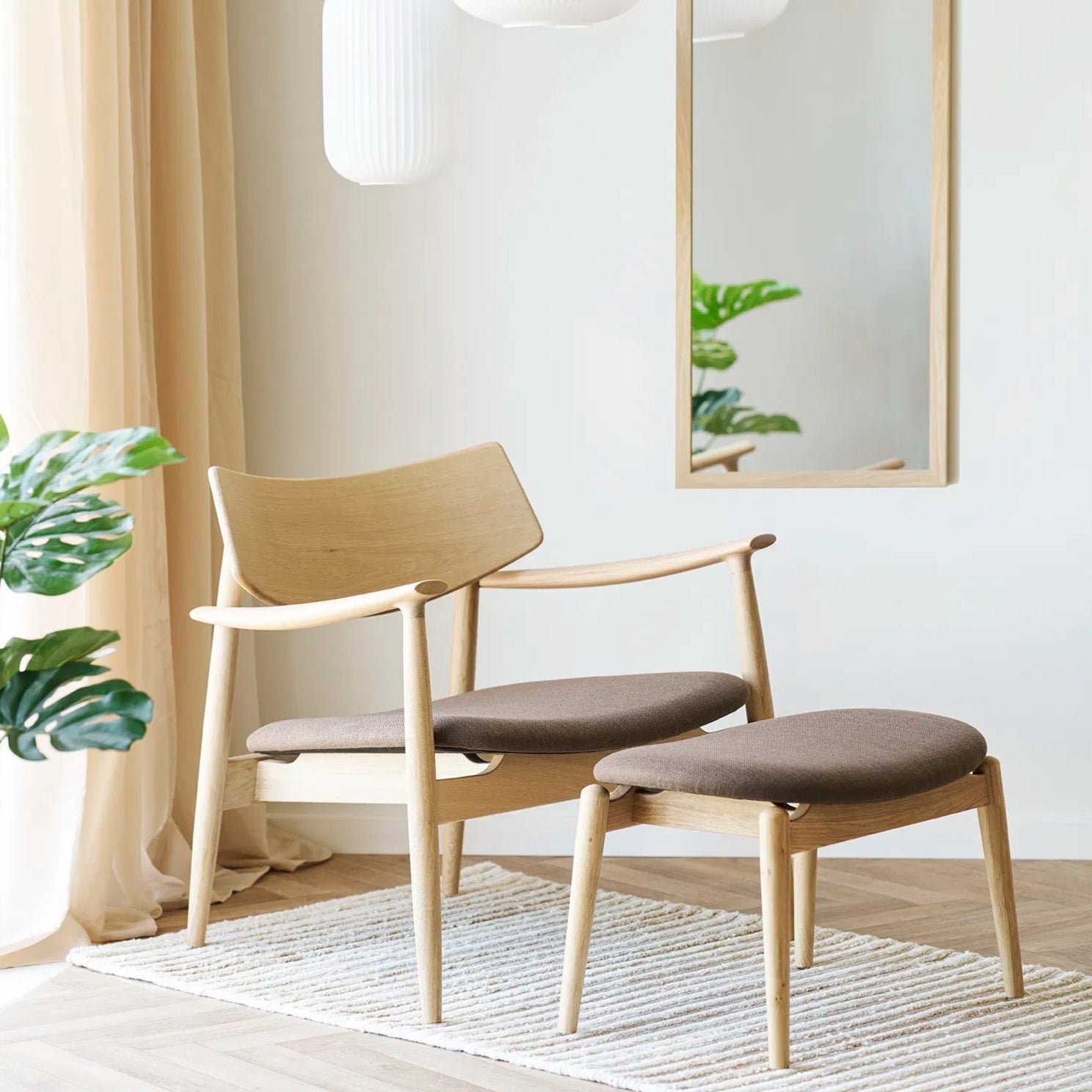 Fotoliu cu taburet, structura din lemn de stejar, tapiterie din poliester 100% si umplutura tip spuma poliuretanica.