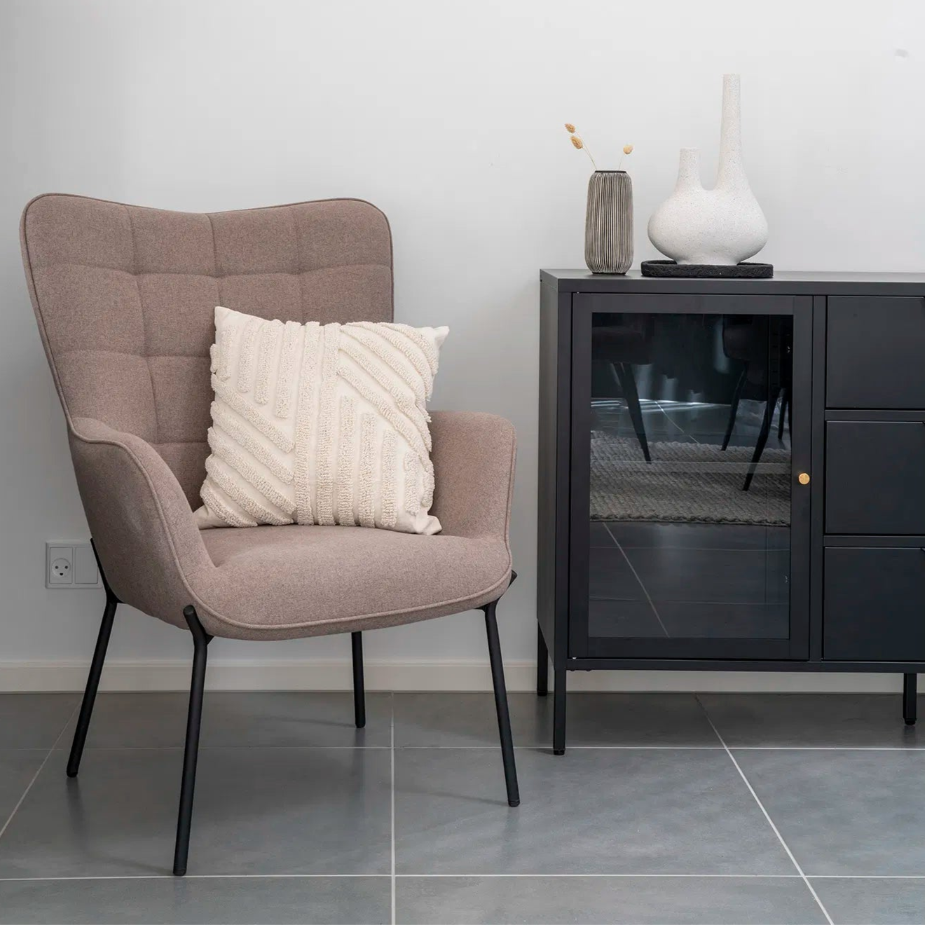 Fotoliu din lemn de pin, otel si tapiterie din poliester 100%.