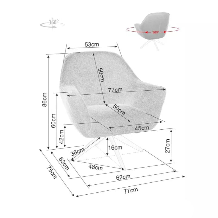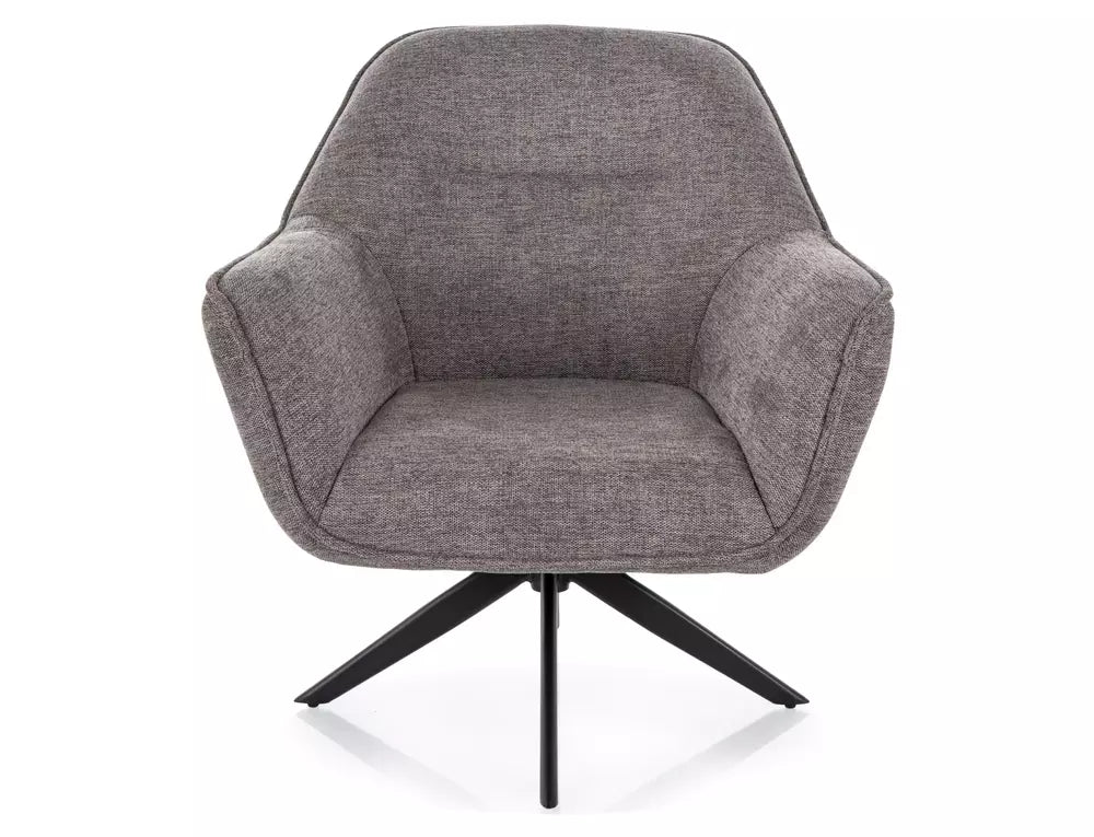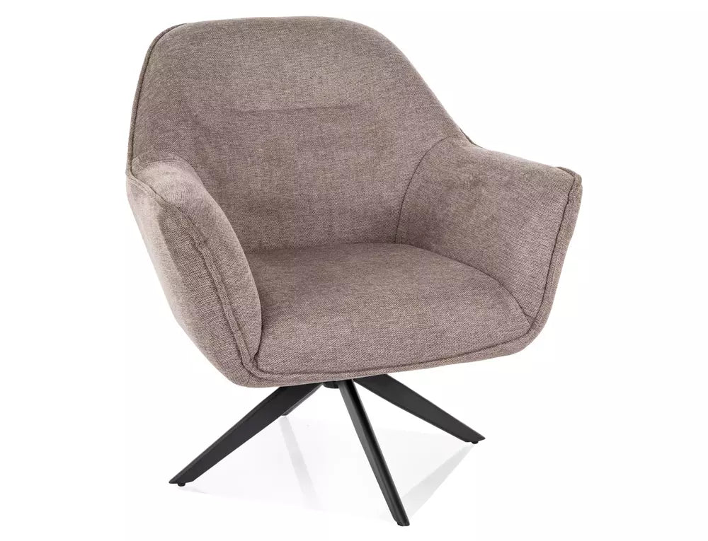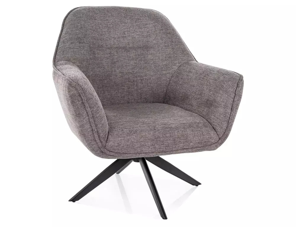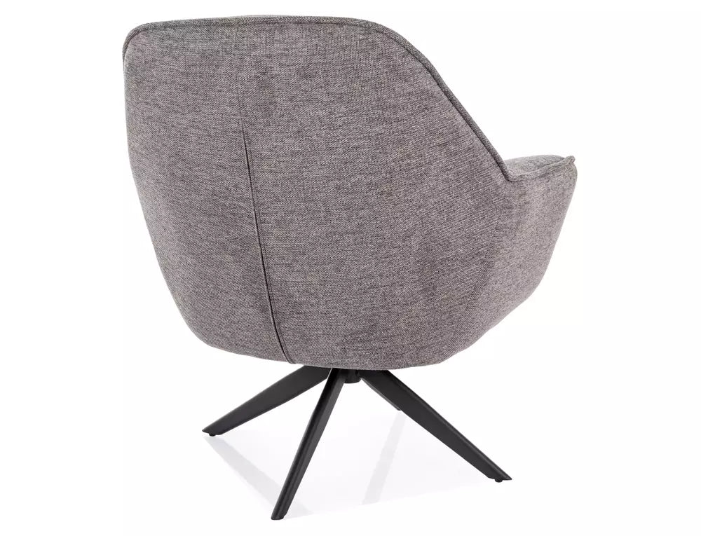 Fotoliu cu tapiterie din material textil, cadru din metal negru mat, sezut rotativ la 360 grade.
