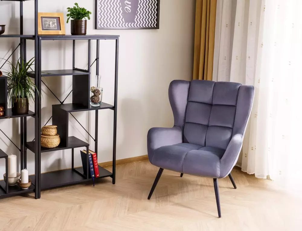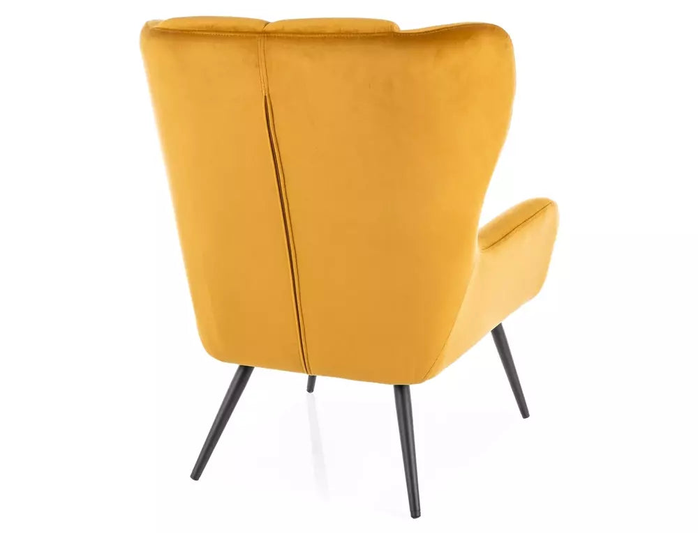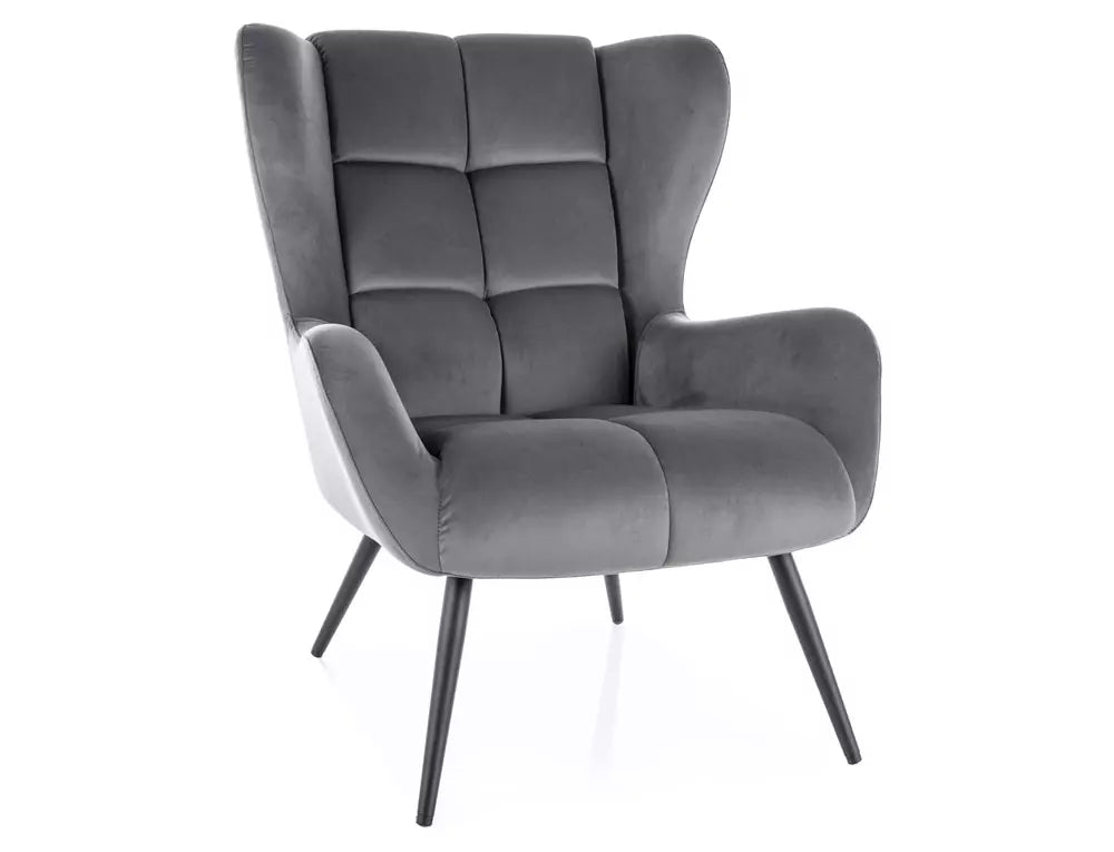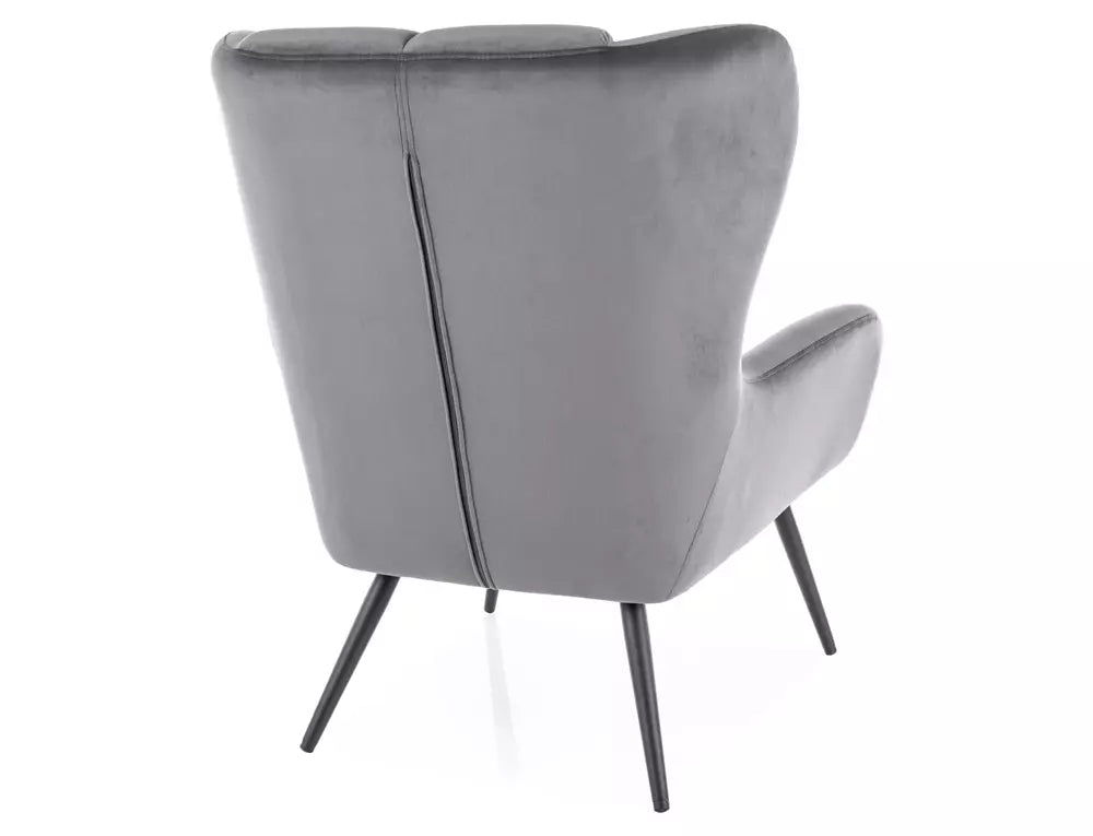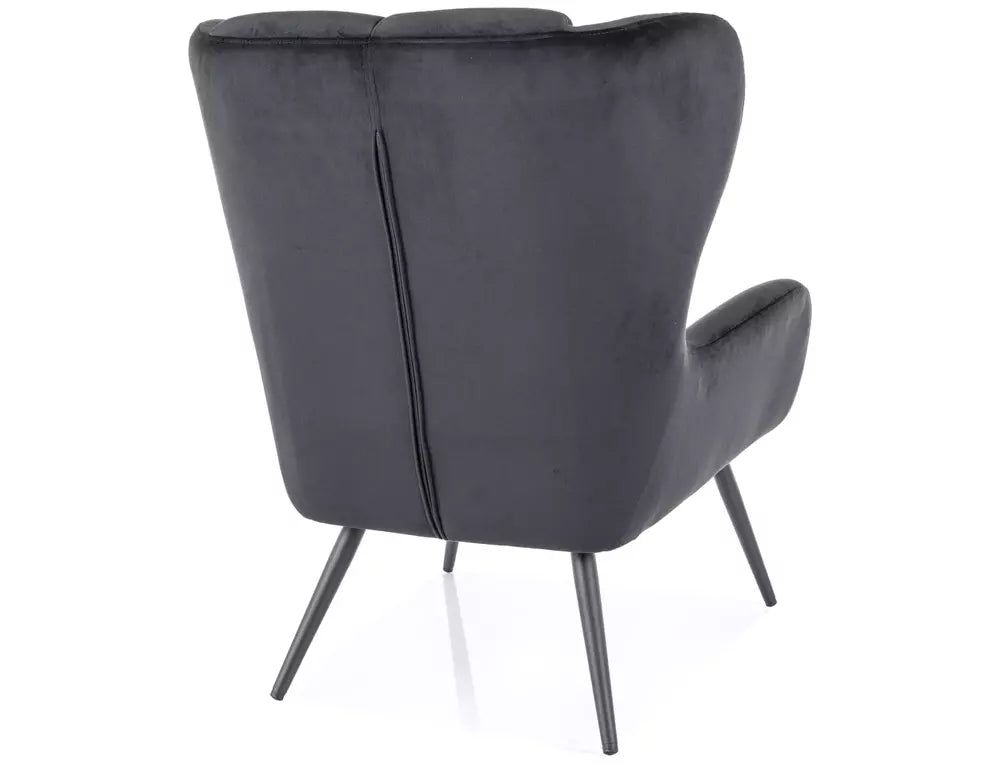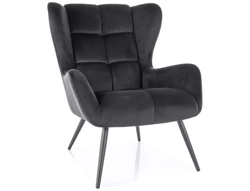 Fotoliu cu tapiterie din catifea, cadru din metal negru mat.
