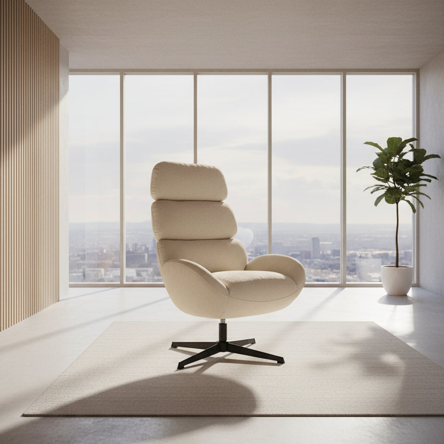 Fotoliu rotativ la 360° cu structura din otel. Sezut din placaj cu tapiterie din poliester. Umplutura din spuma poliuretanica.