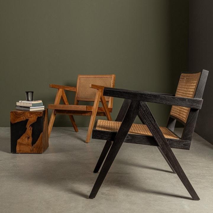 Fotoliu din lemn de tec, finisaj natural cu vopsea nitrocelulozica, spatar cu ratan.