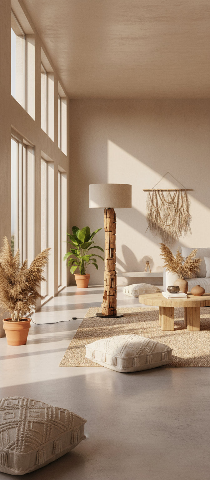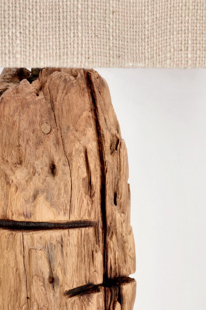 Lampadar in stil natural, realizata din lemn de tec reciclat, finisaj pe baza de apa, abajur din material textil (bumbac) si baza din lemn.