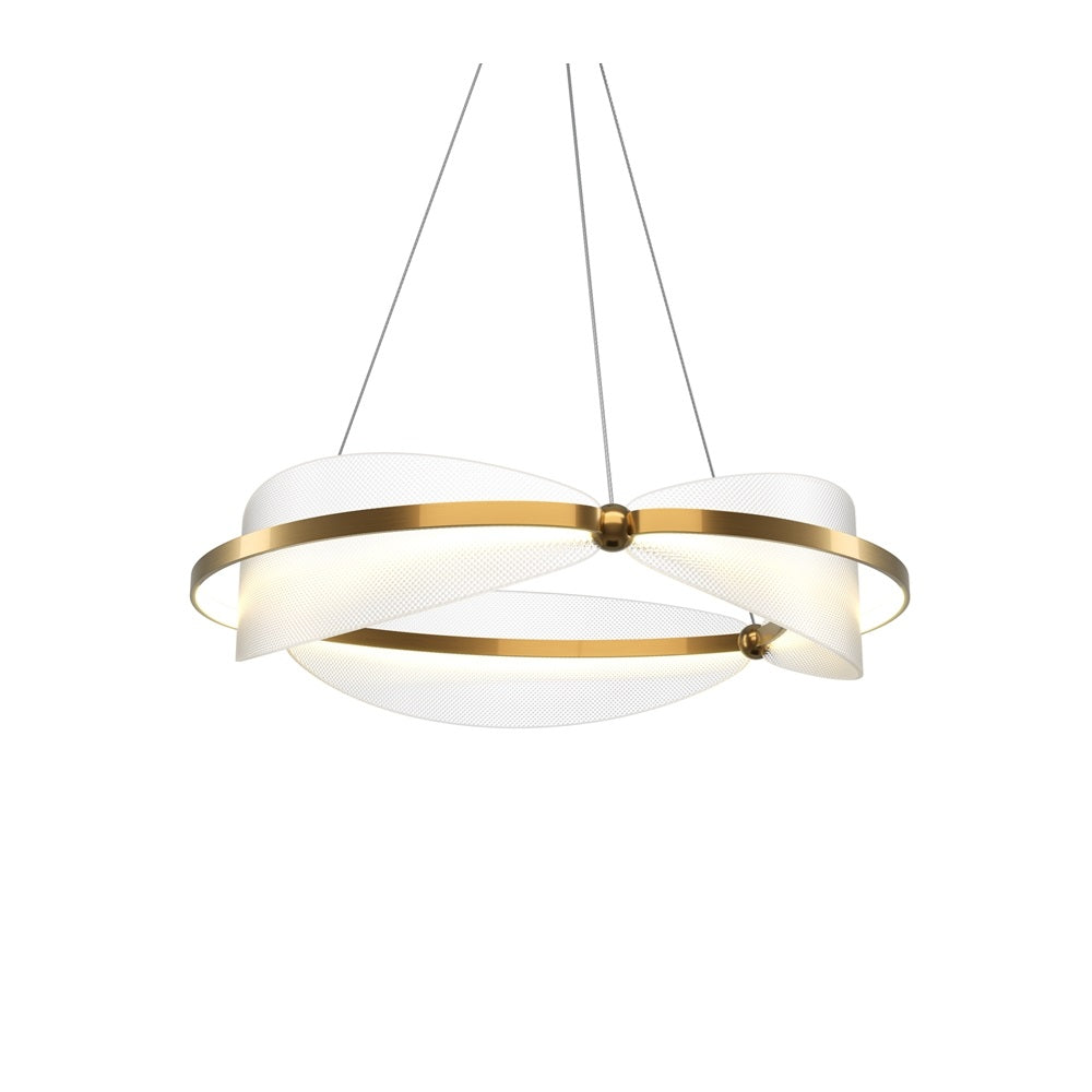 Lampa suspendata realizata din metal (aluminiu) culoarea alamei, elemente decorative din acril texturat transparent, cu LED integrat.