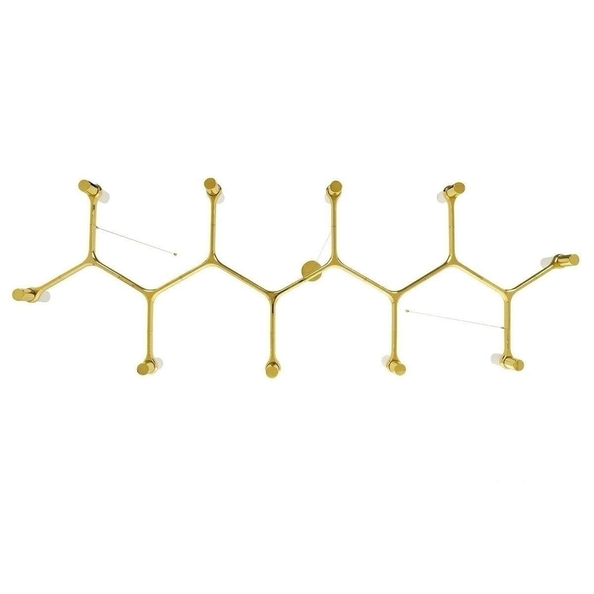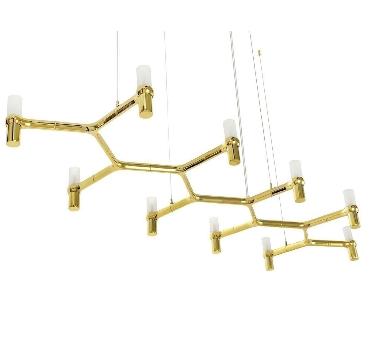 Lampa suspendata din metal de culoare aurie cu finisaj stralucitor, suspendata pe cabluri de otel.
