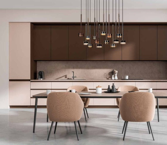 Lampa suspendata moderna, realizata din metal si sticla, cu 14 surse de lumina.