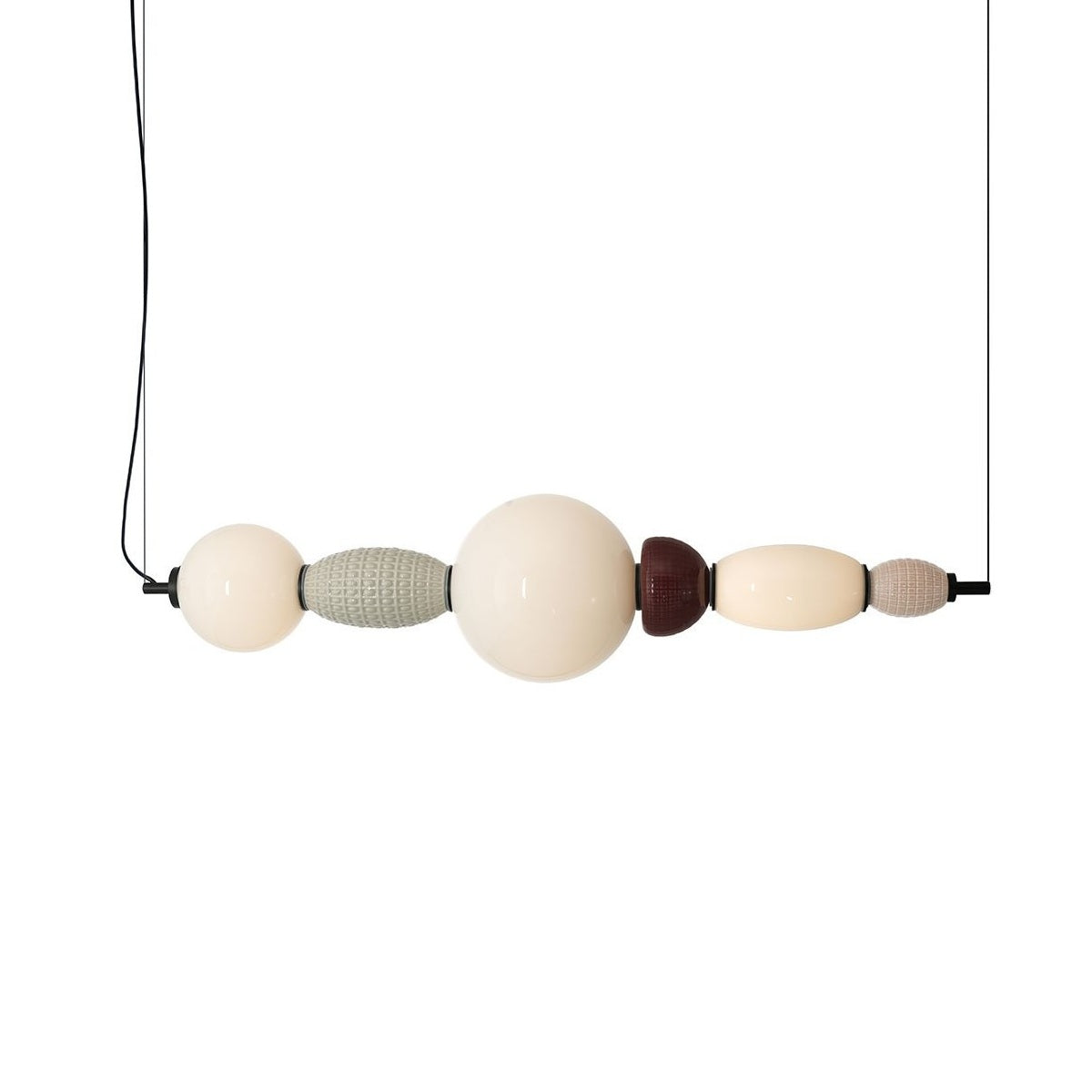 Lampa suspendata realizata din ceramica, sticla si fier, cu sursa de lumina inclusa.