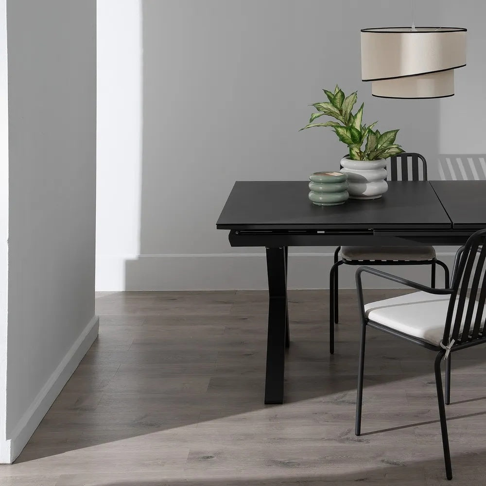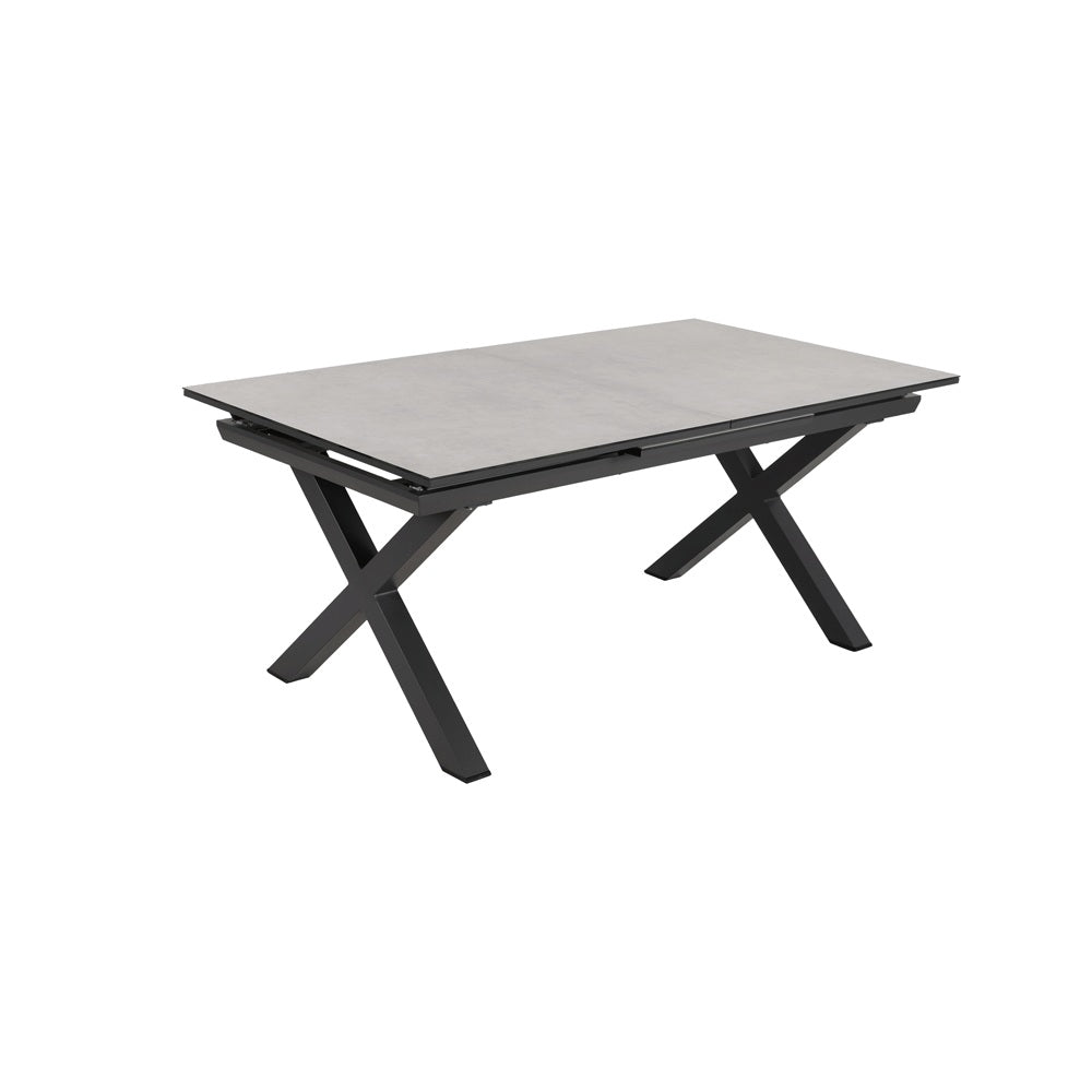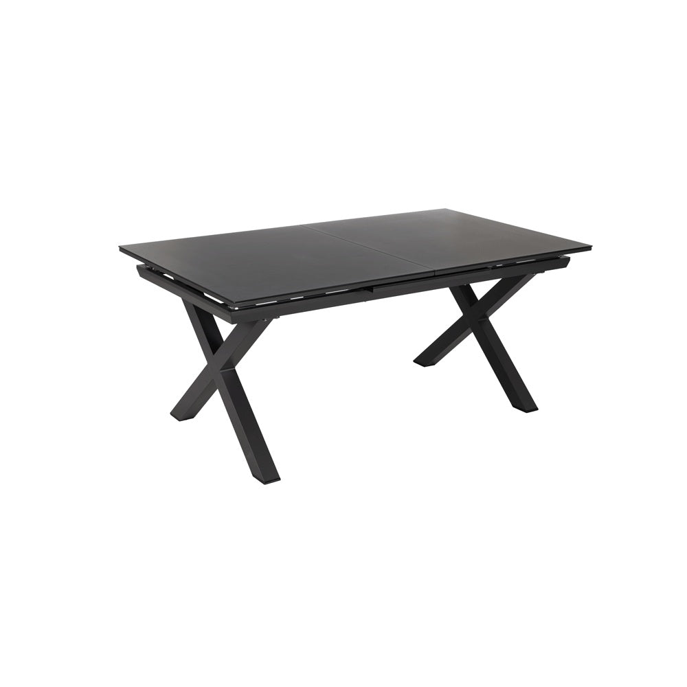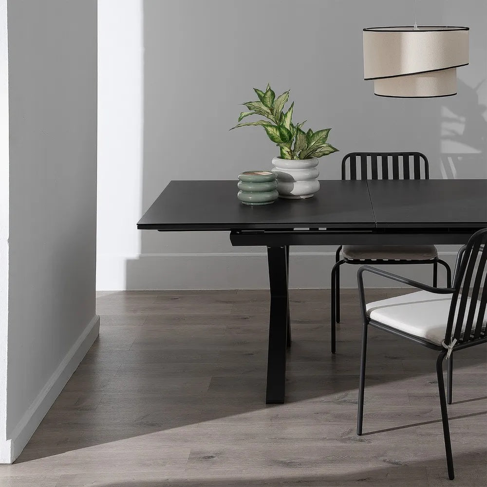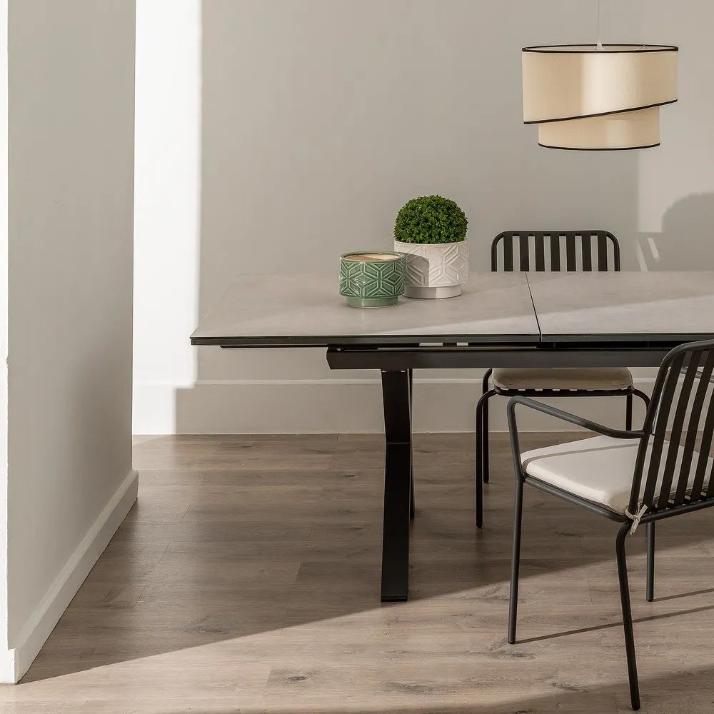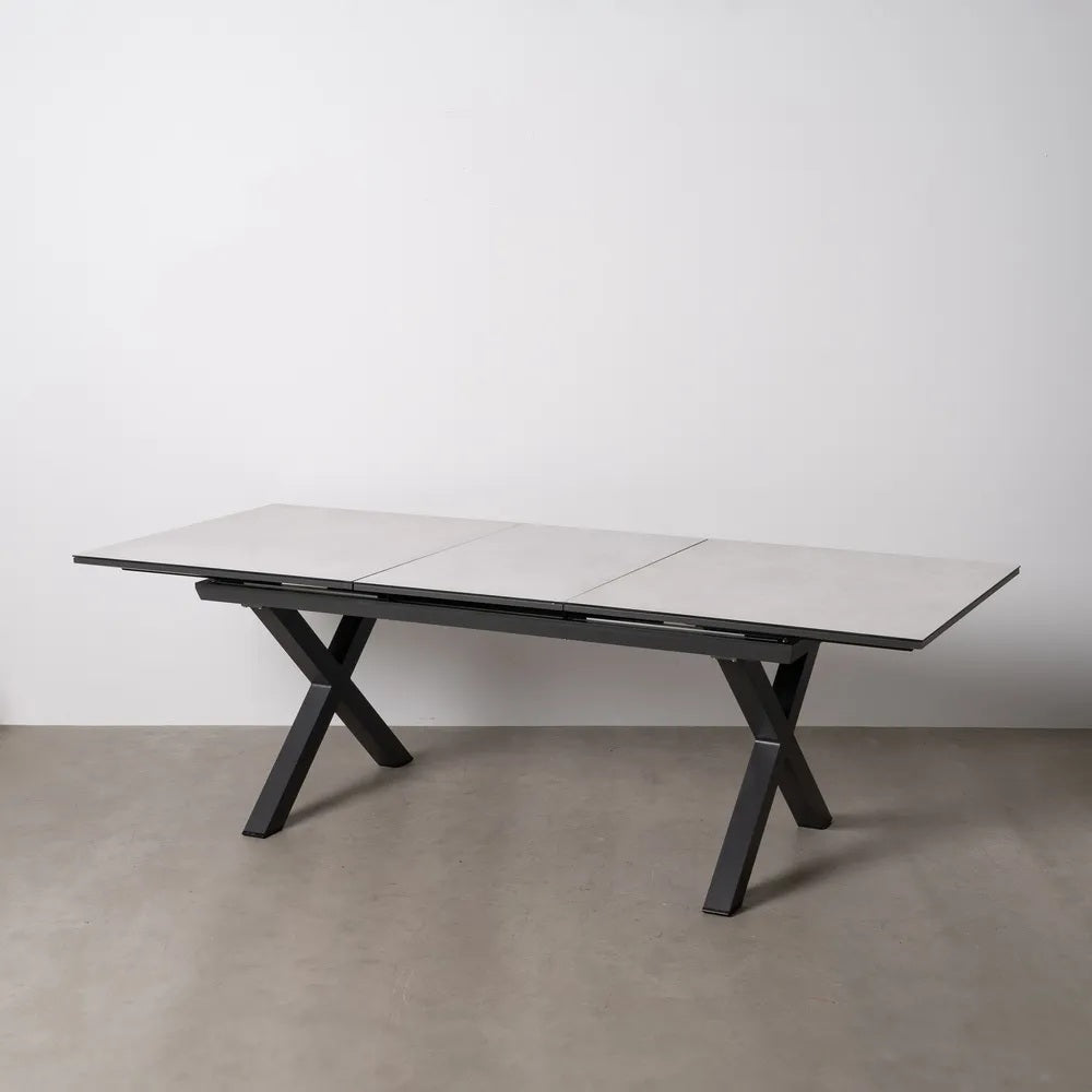 Masa extensibila cu blat din sticla si ceramica, picioare din aluminiu.