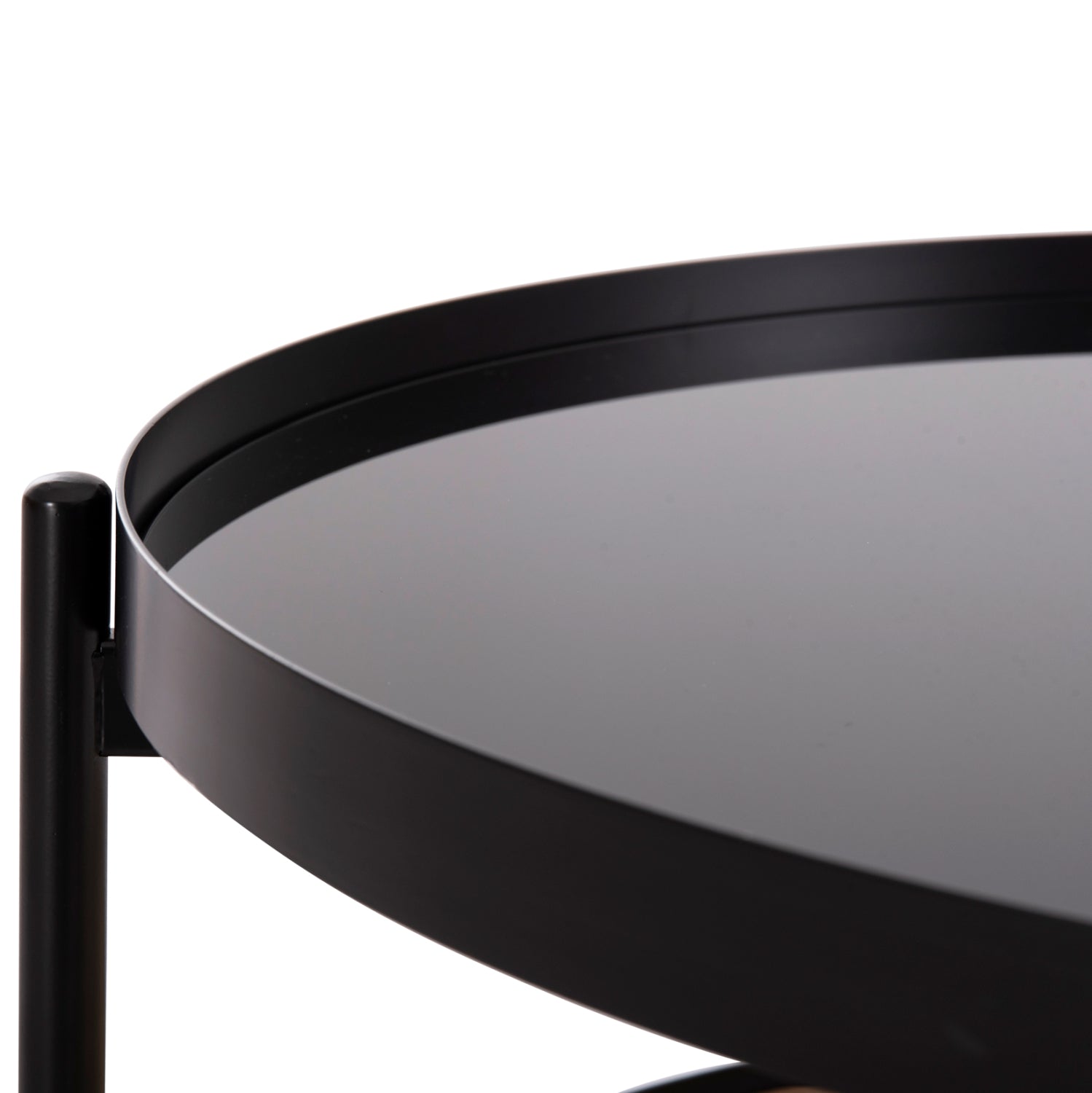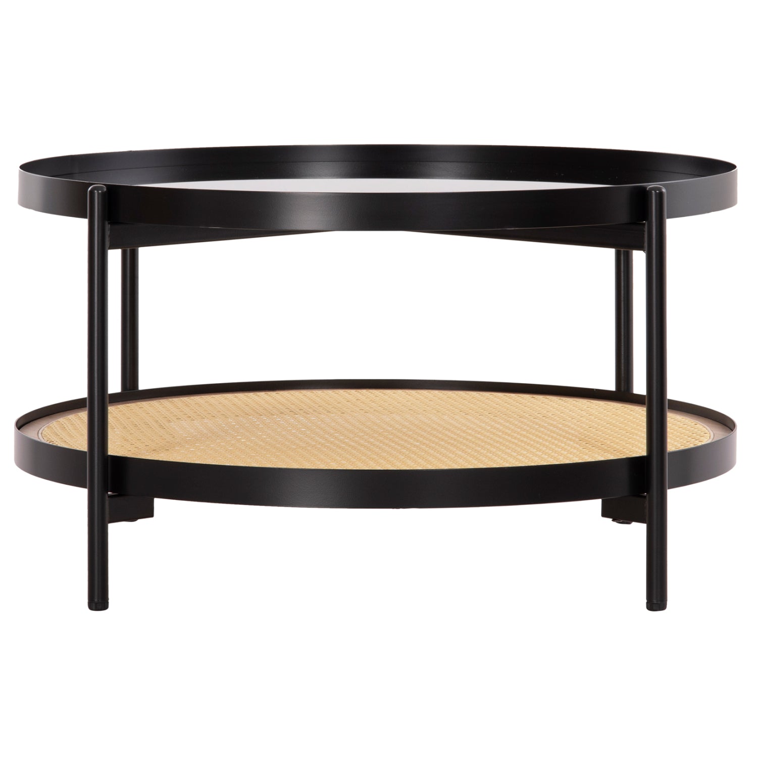 Masă laterală rotundă frumoasă și relativ înaltă. Caracteristica sa este că are 2 blaturi susținute de baze metalice negre în formă de cruce. Blatul superior este din sticlă securizata de culoare neagră, în timp ce blatul inferior este din ratan împletit, de culoare naturală. O masă unică, care combină aspectul practic și luxul pentru spațiul dvs.