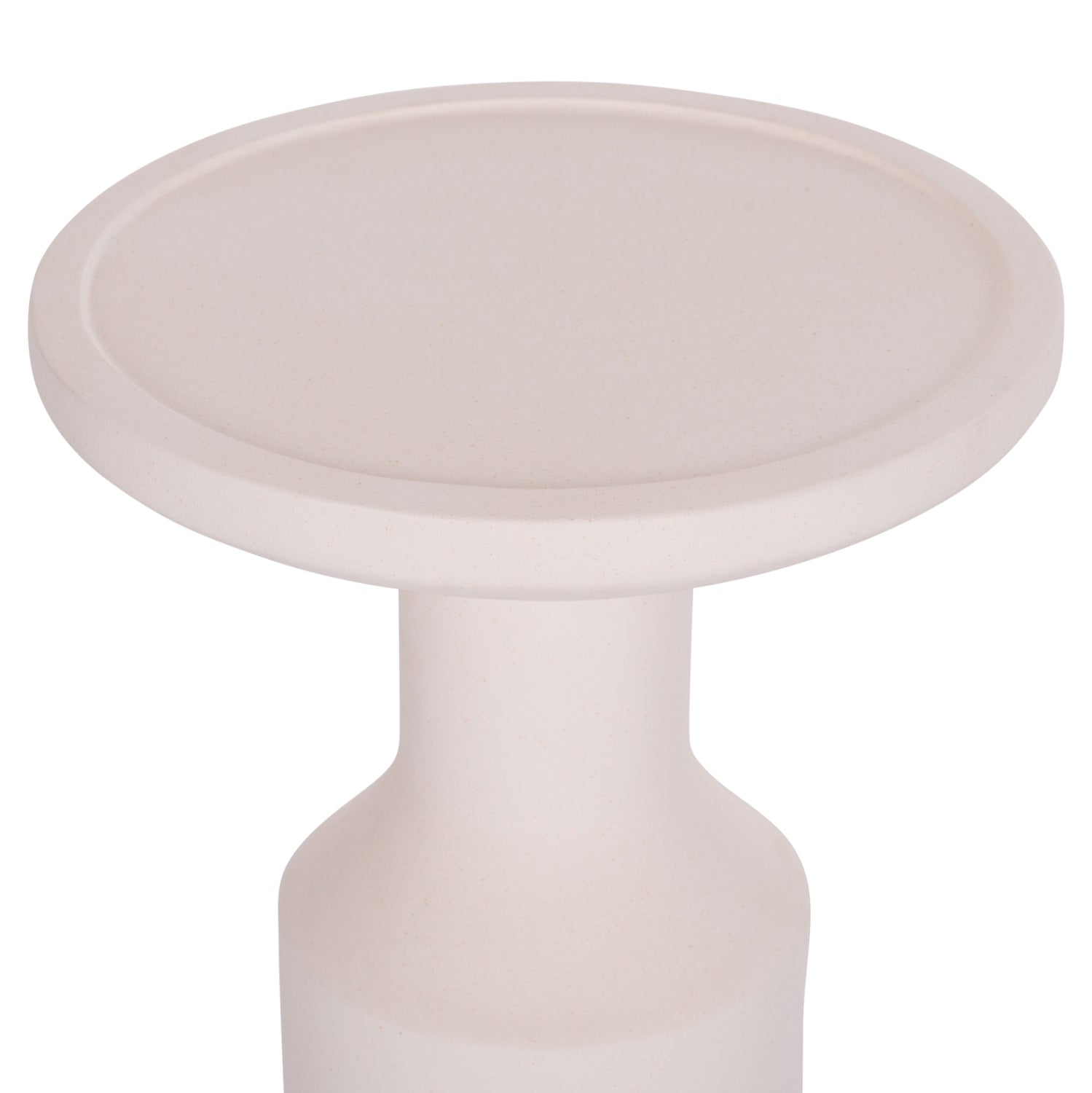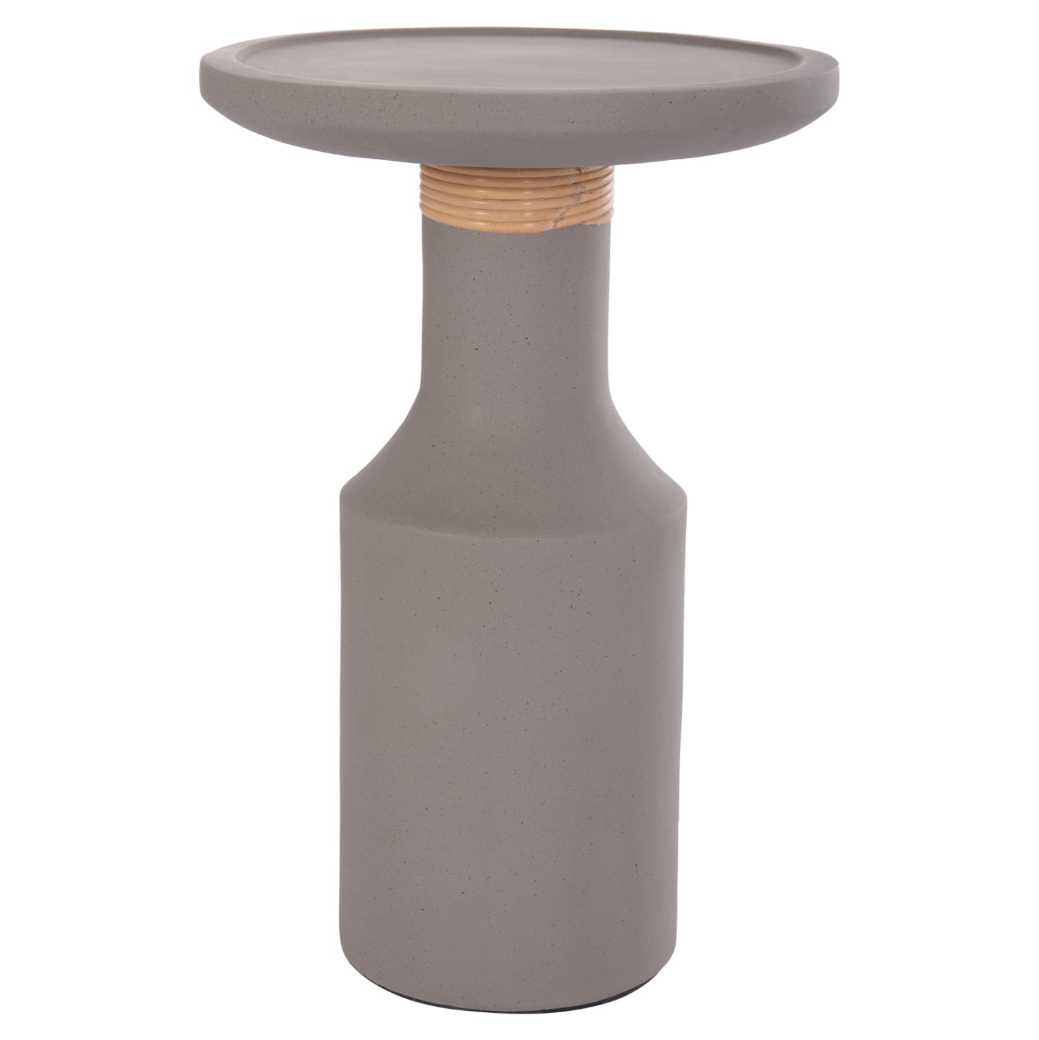 Masuta de cafea inalta si rotunda din fibrociment, cu un decor din ratan natural.