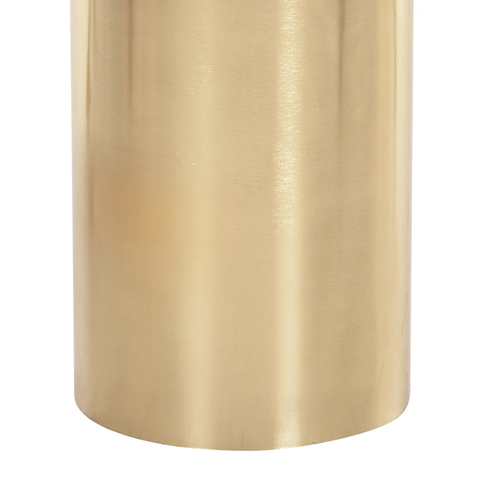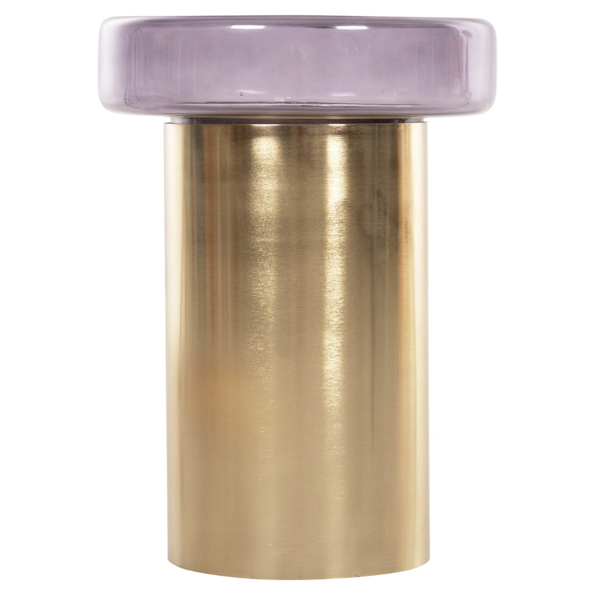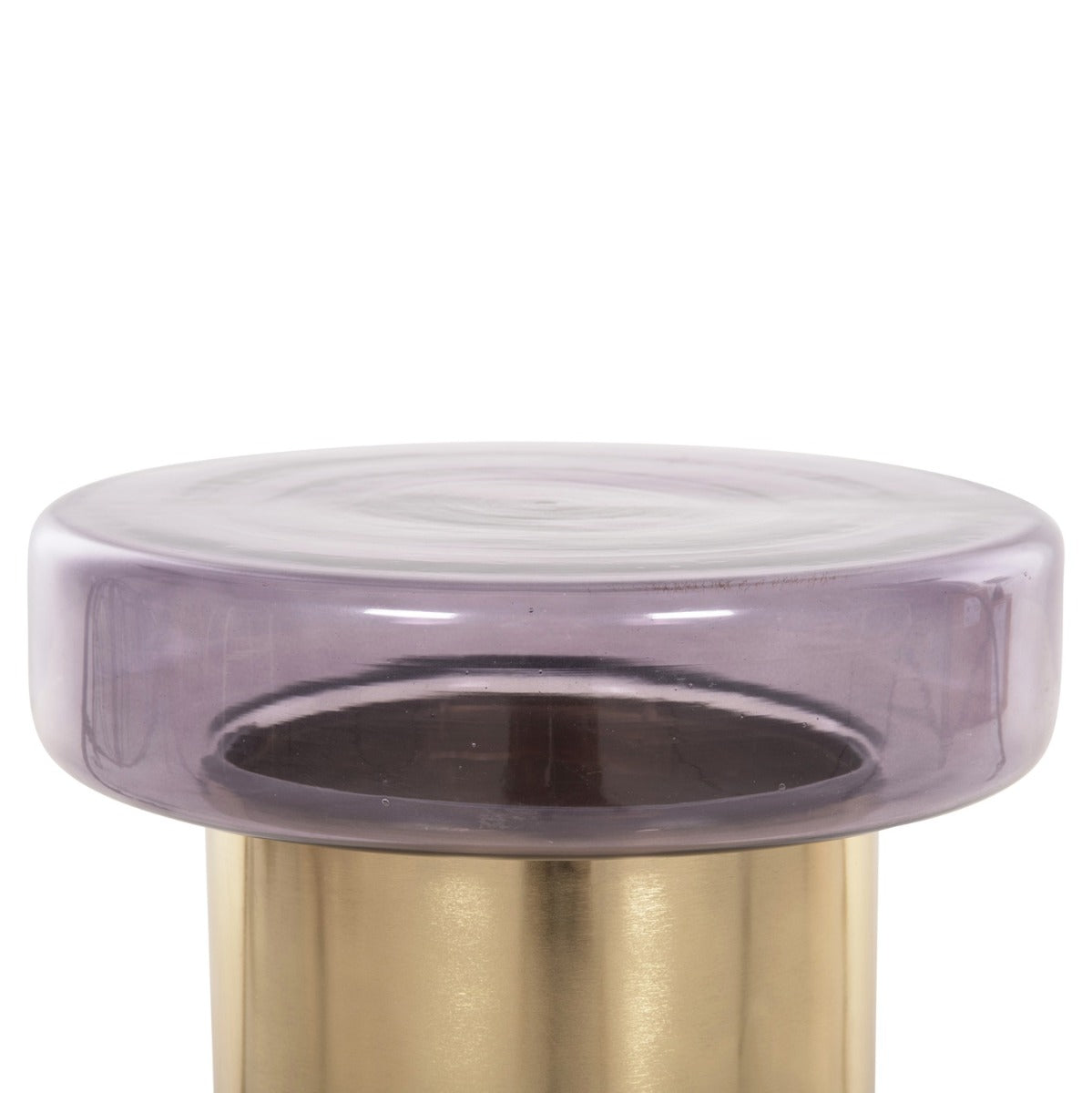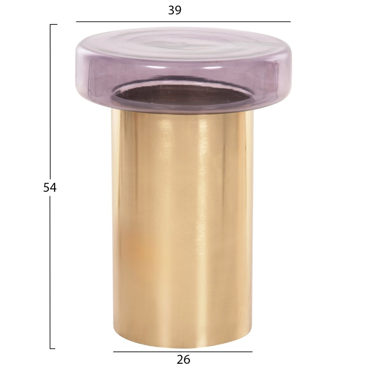 Masuta de cafea cu baza cilindrica din metal de culoare aurie si blat de sticla de culoare mov.