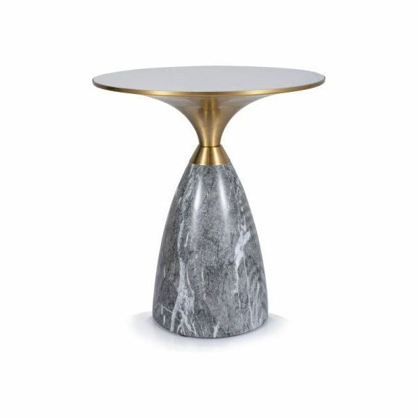 Masuta de cafea cu blat din ceramica de culoare alb lucios cu efect de marmura si cadru din metal gri cu auriu.