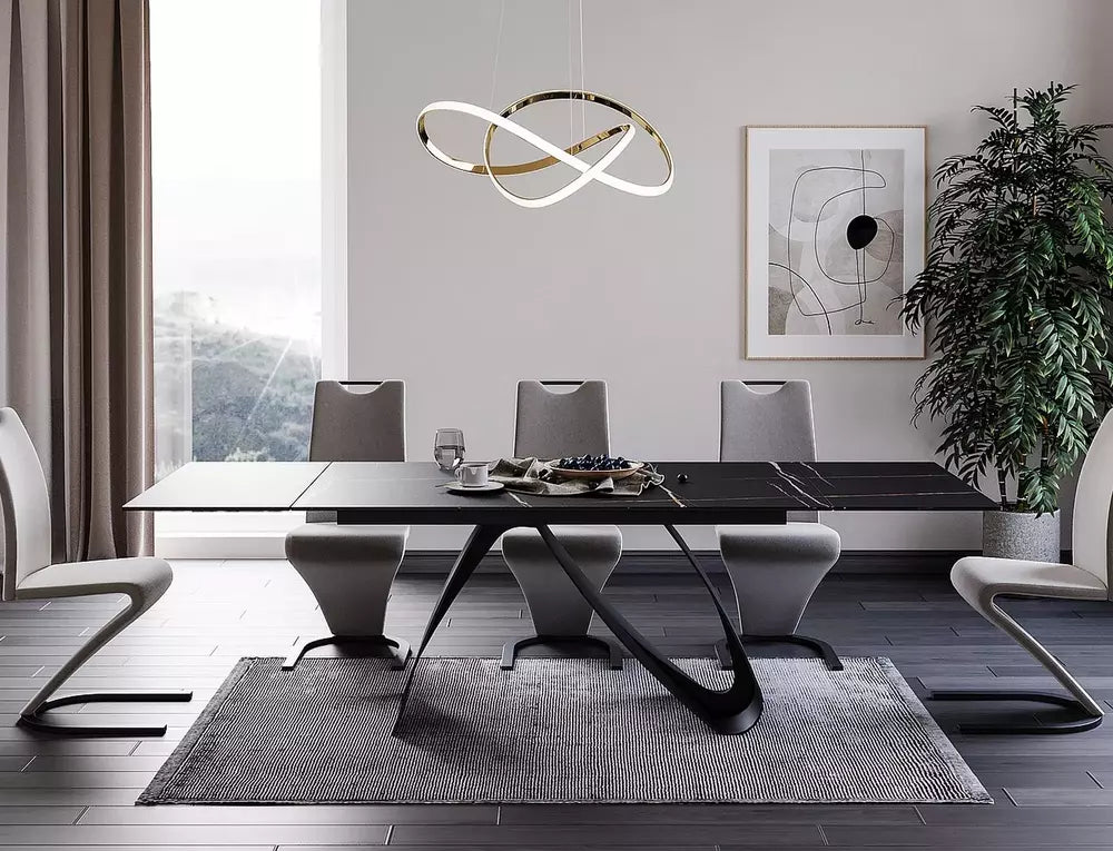 Masa extensibila eleganta, realizata dintr-un blat din sticla securizata si ceramica italiana Sahara Noir, cu o structura din metal vopsita in negru mat.