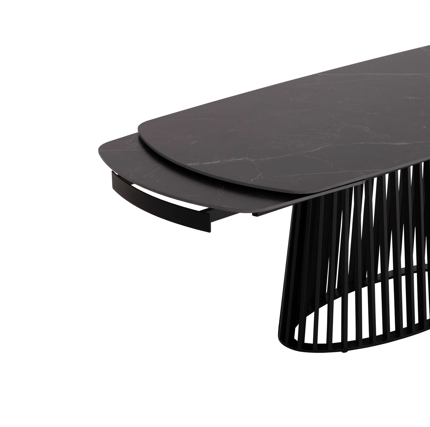 Această masă de dining deosebită combină minunat caracterul practic cu luxul. Este extensibilă cu mecanisme de extensie ușor de utilizat, în timp ce blatul mesei este din ceramică cu aspect BLACK MARBLE! Cadrul metalic (acoperit cu pulbere) și baza ovală cu design uimitor de culoare NEAGRĂ completează imaginea și sporesc luxul care este evident în fiecare centimetru al acestei mese!