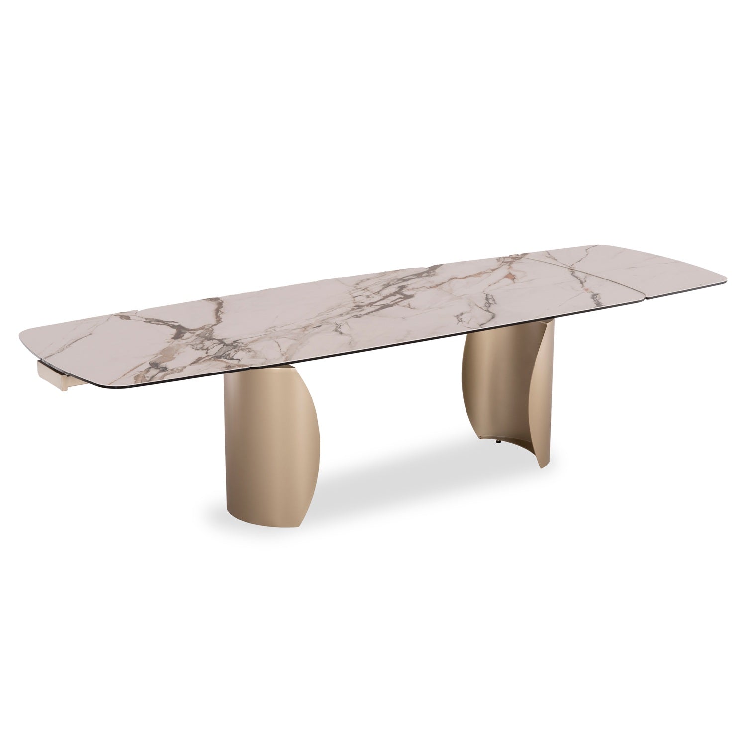 Este extensibilă cu mecanisme de extensie ușor de utilizat, iar blatul este ceramic cu aspect de MARMURĂ ALBĂ, laminat cu o sticlă suplimentară de 10 mm!