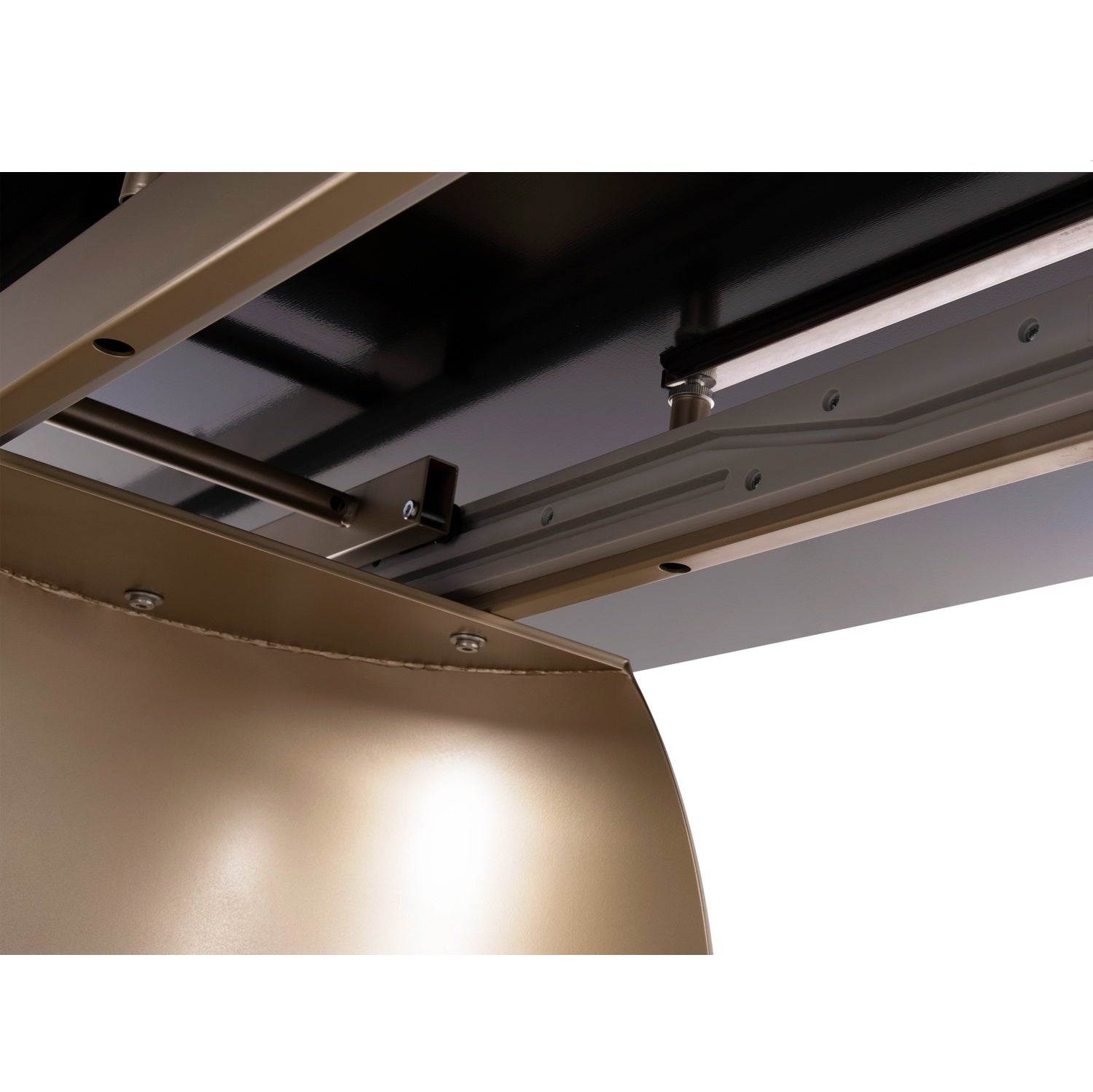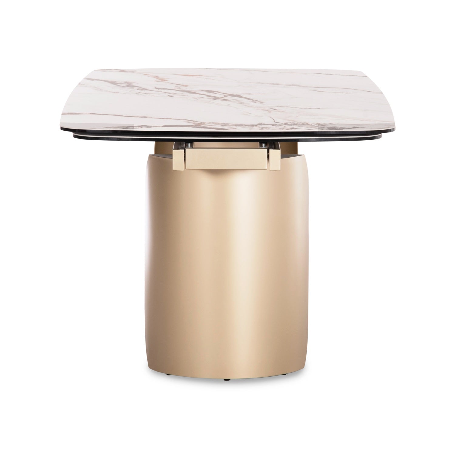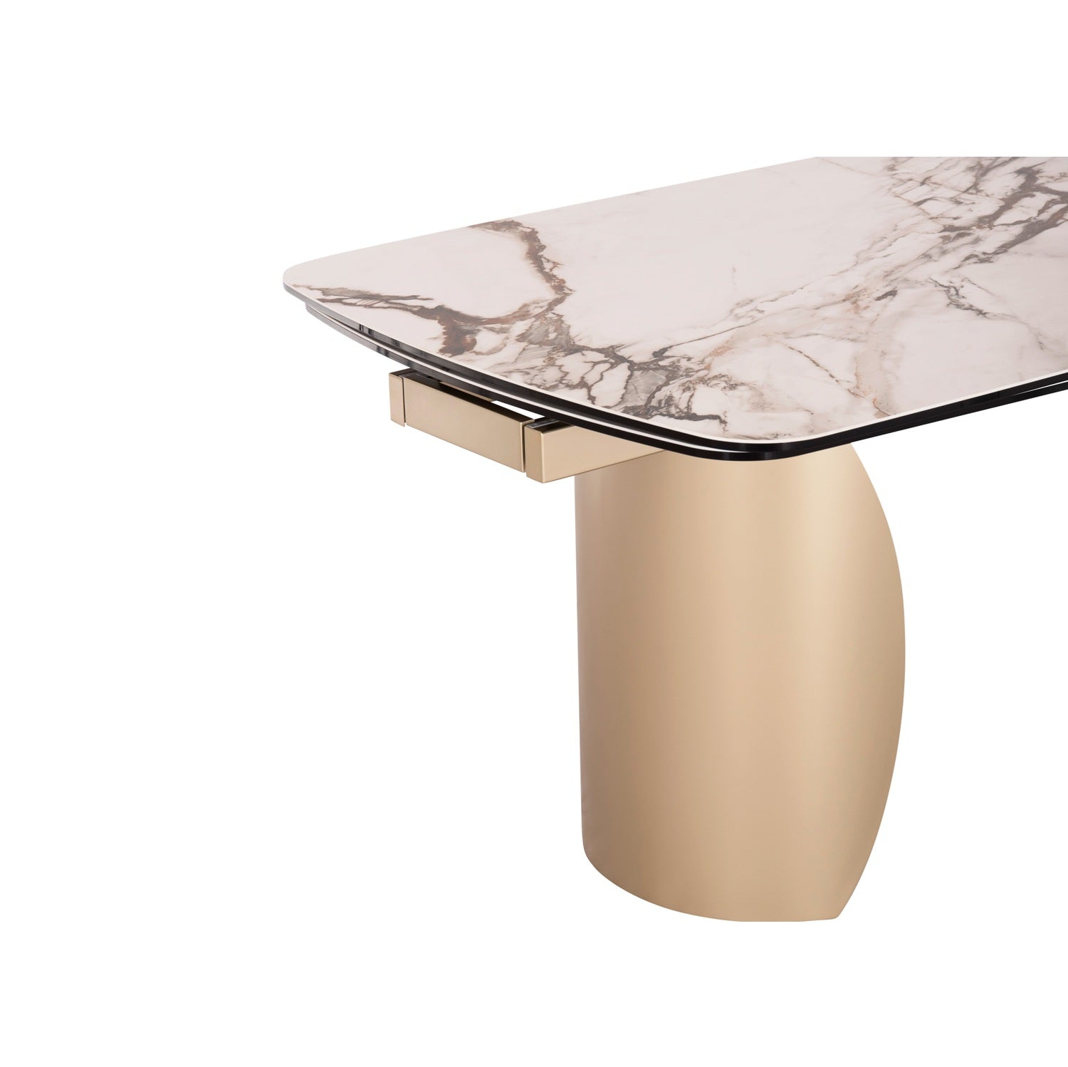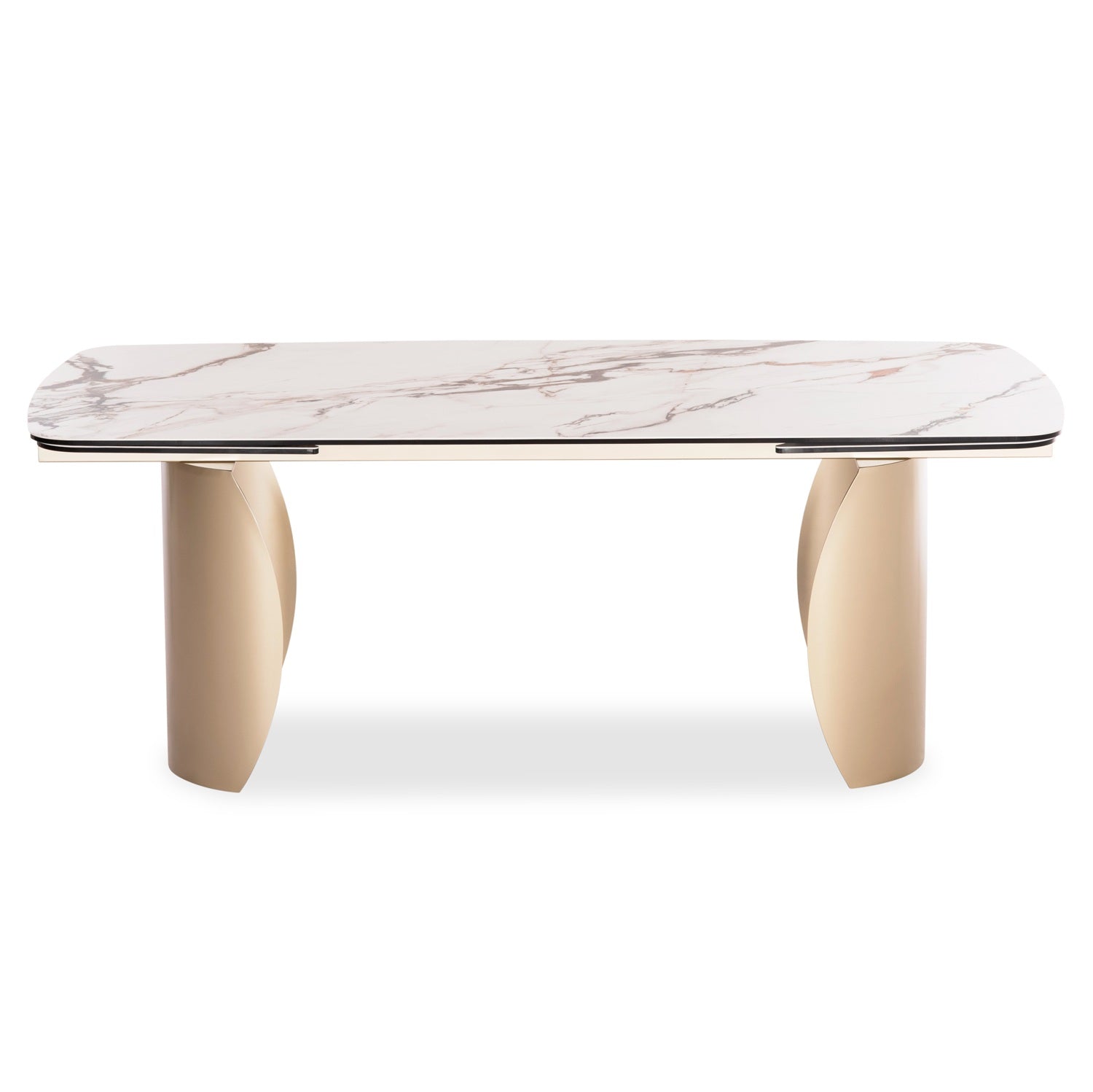 Cadrul metalic și picioarele cu designul uimitor în culoarea CHAMPAGNE completează imaginea și sporesc luxul evident în fiecare centimetru al acestei mese!