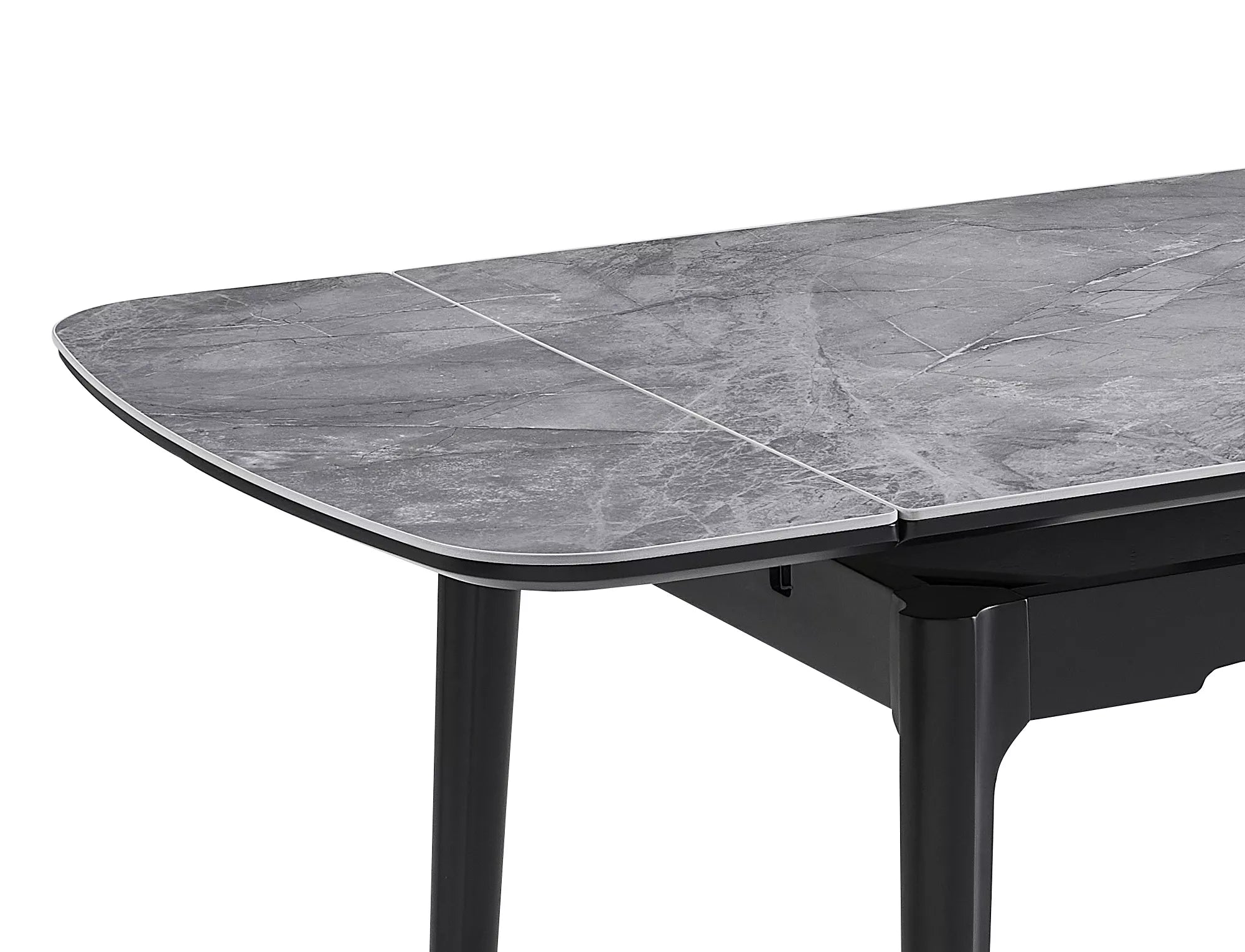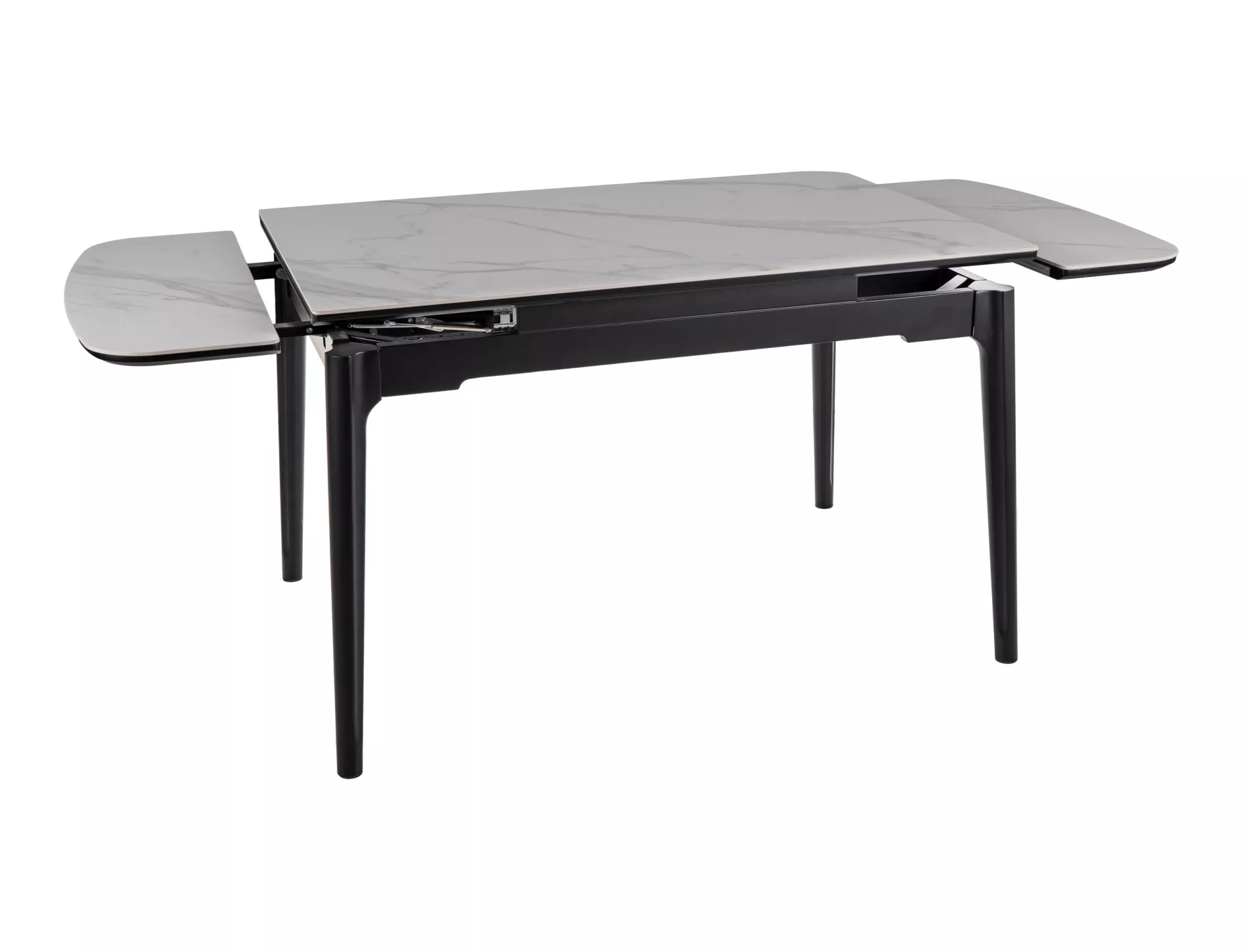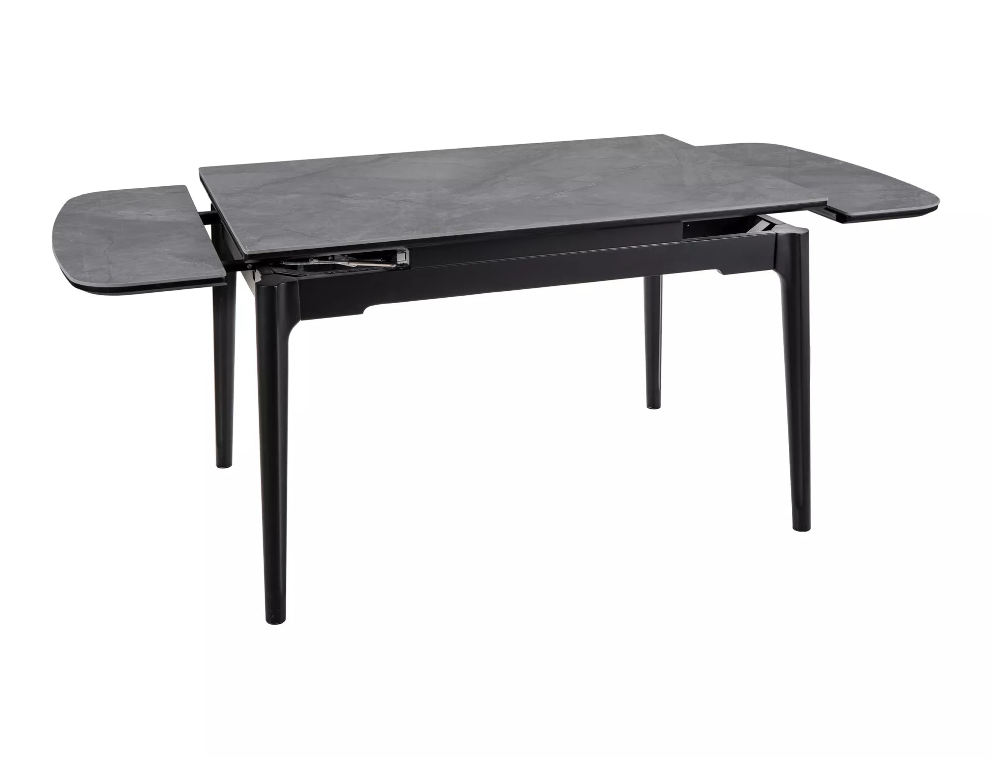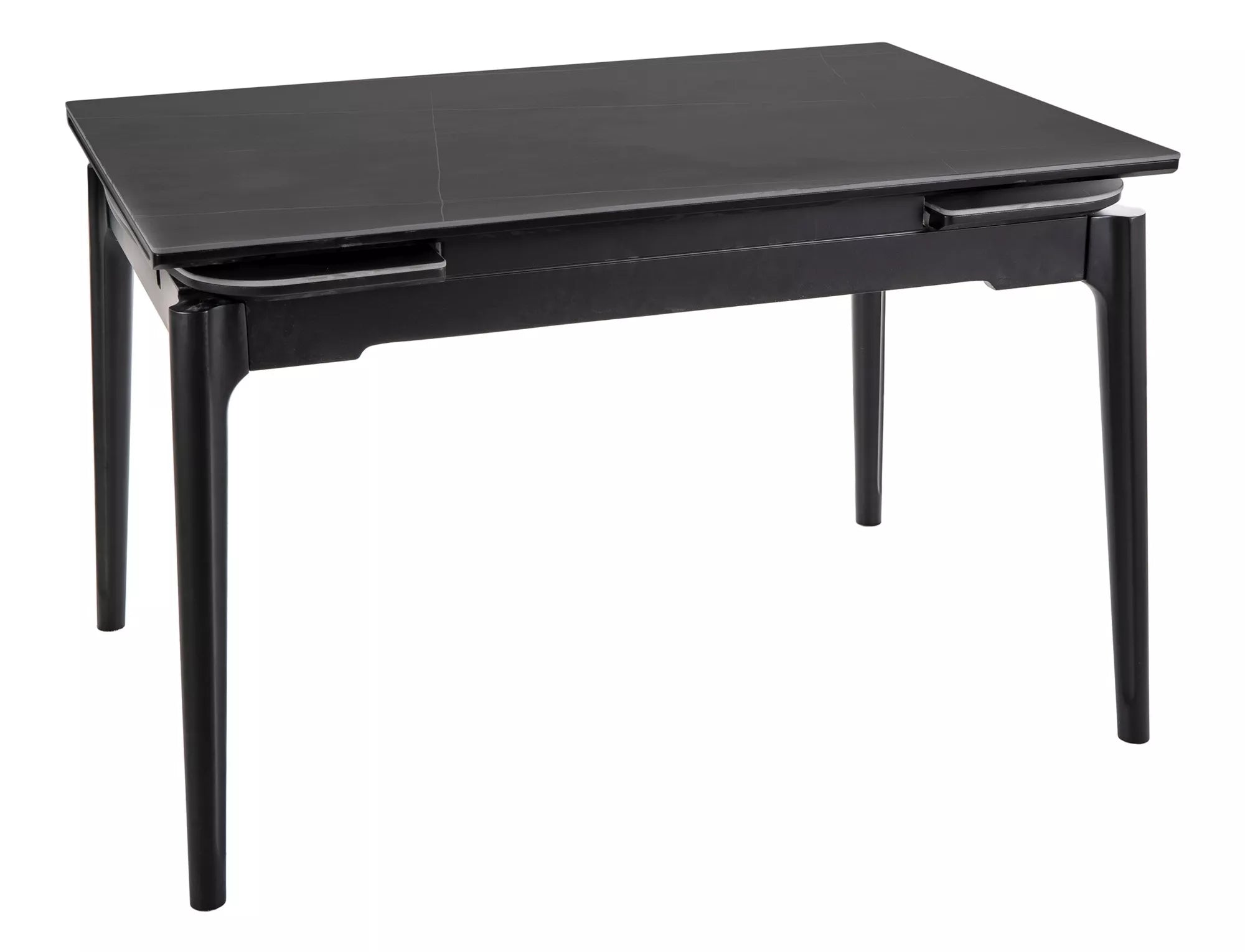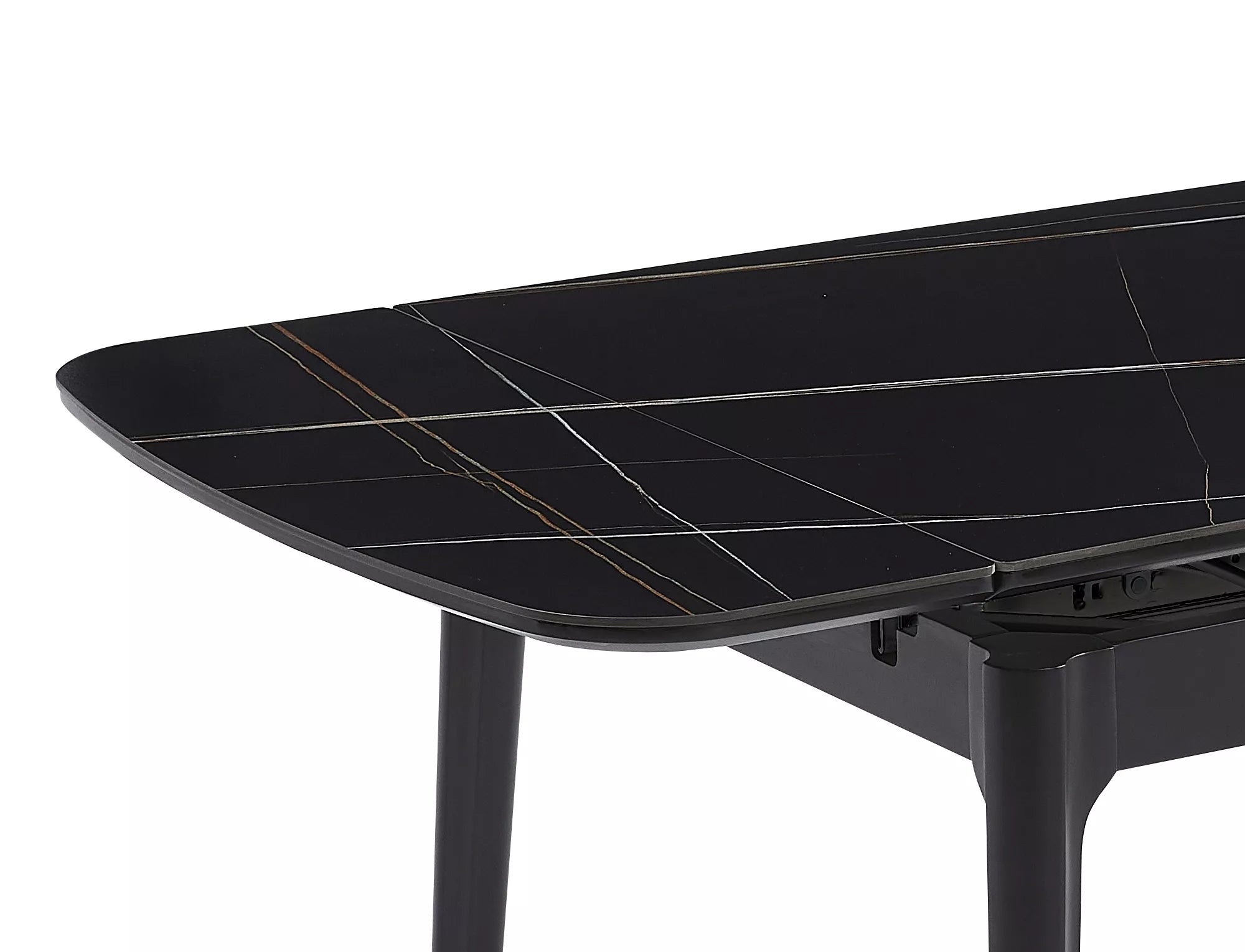 Masa extensibila eleganta, realizata dintr-un blat din ceramica, cu structura din lemn culoare negru mat.