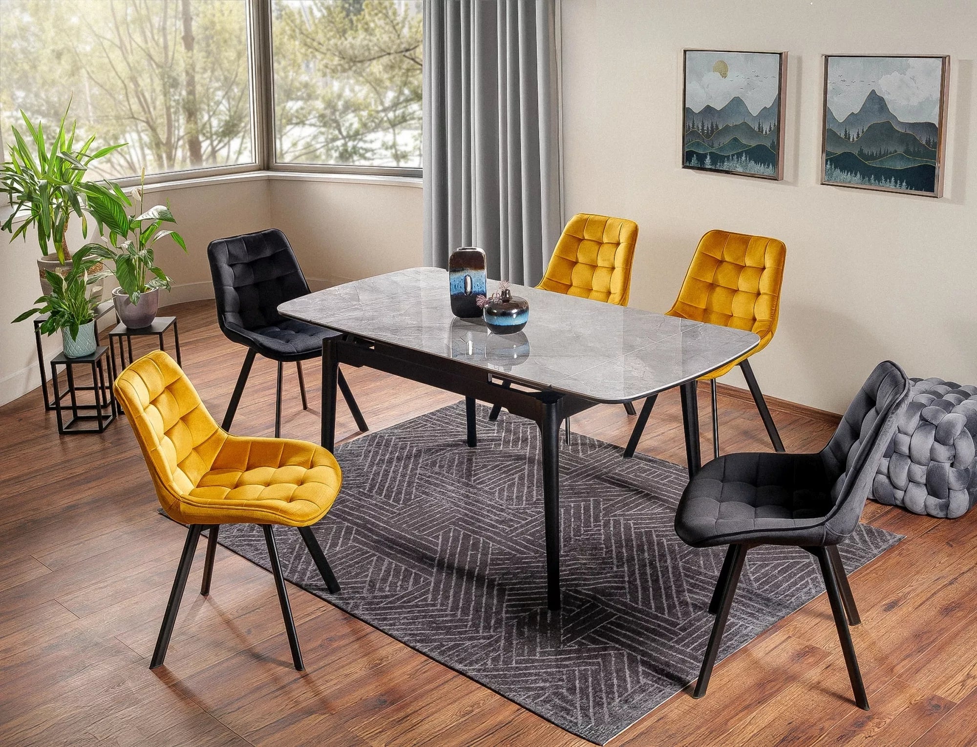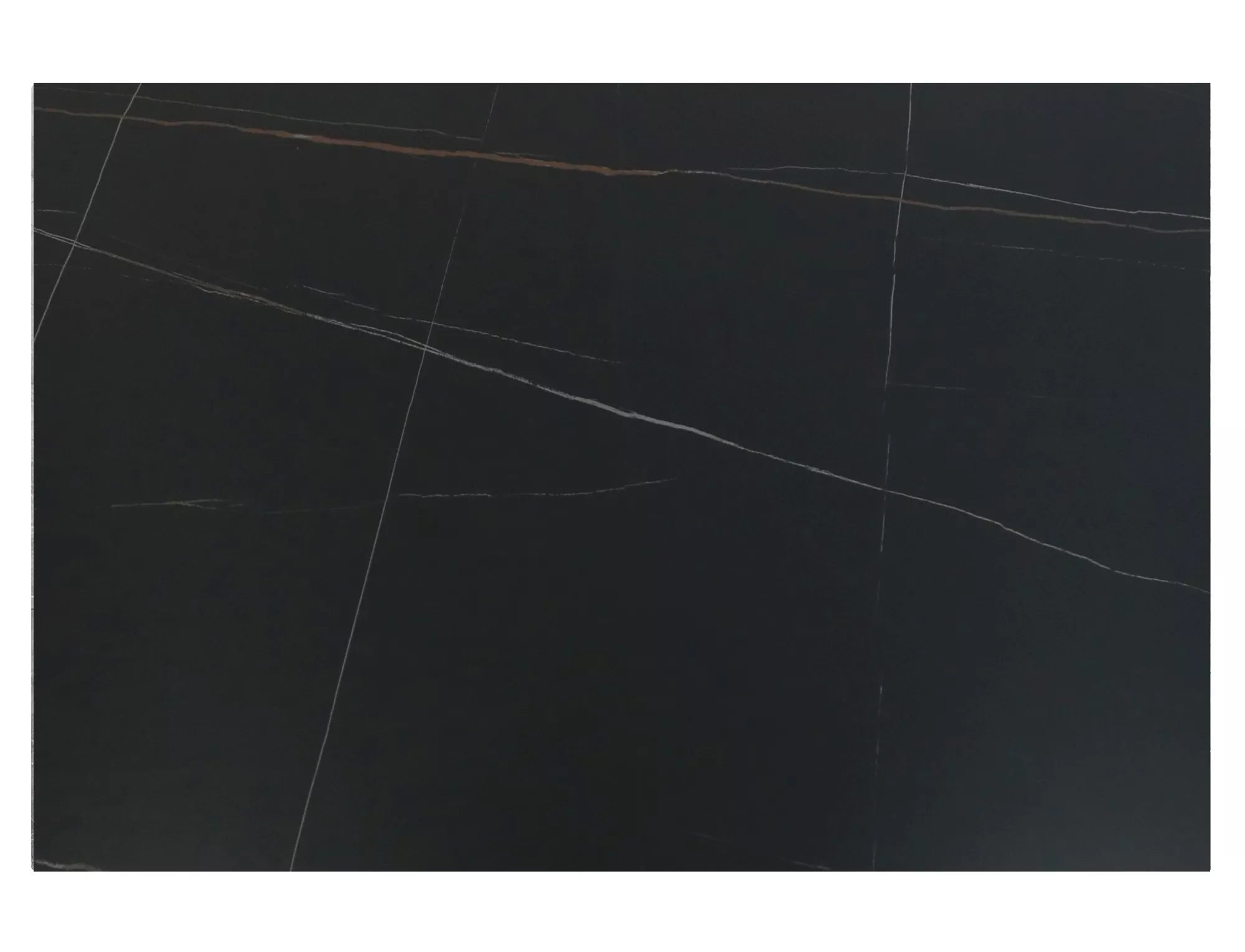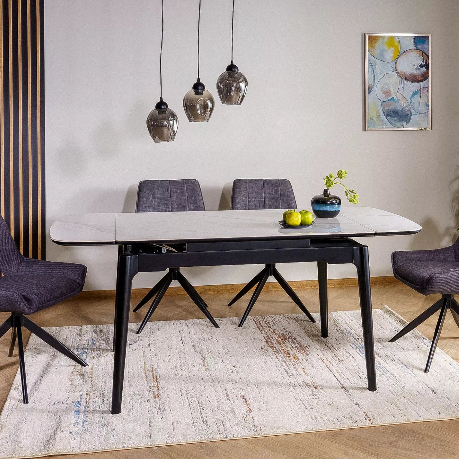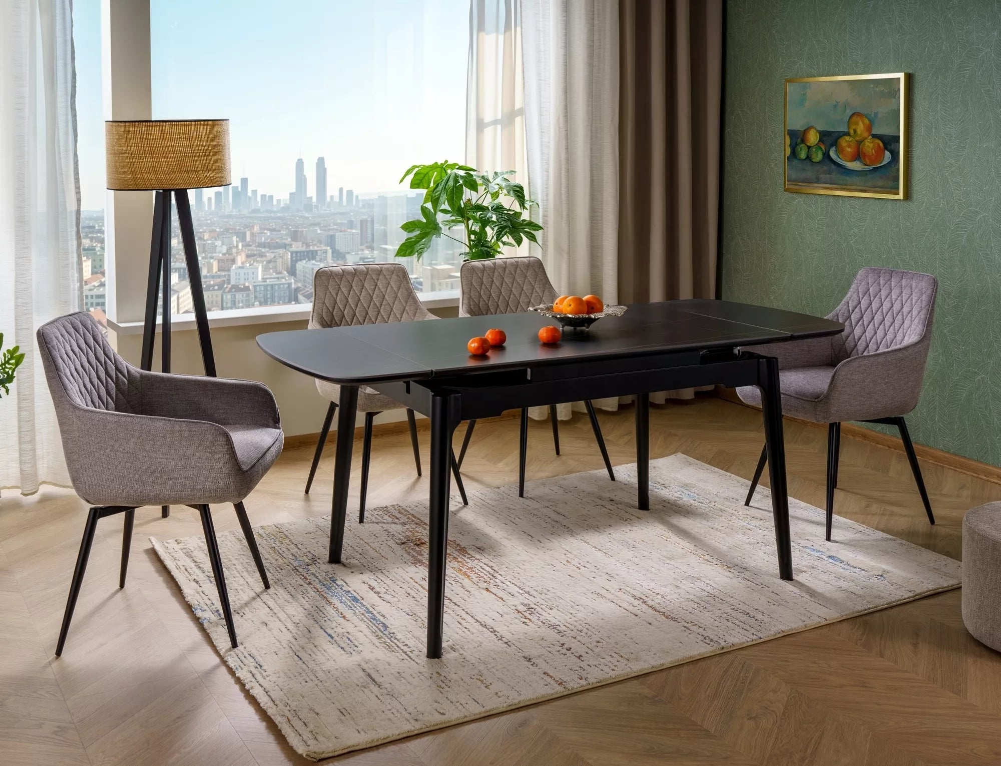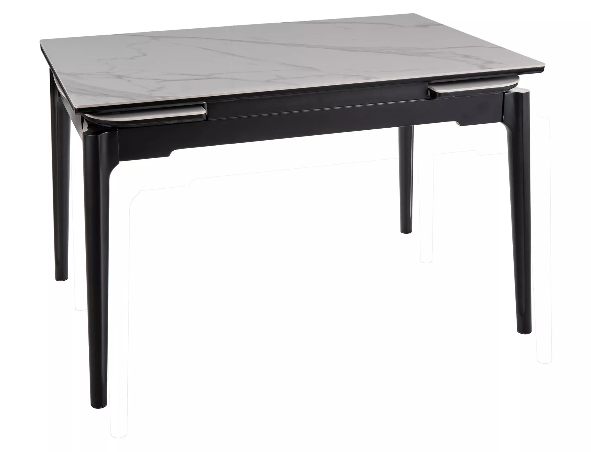 Masa extensibila eleganta, realizata dintr-un blat din ceramica, cu structura din lemn culoare negru mat.