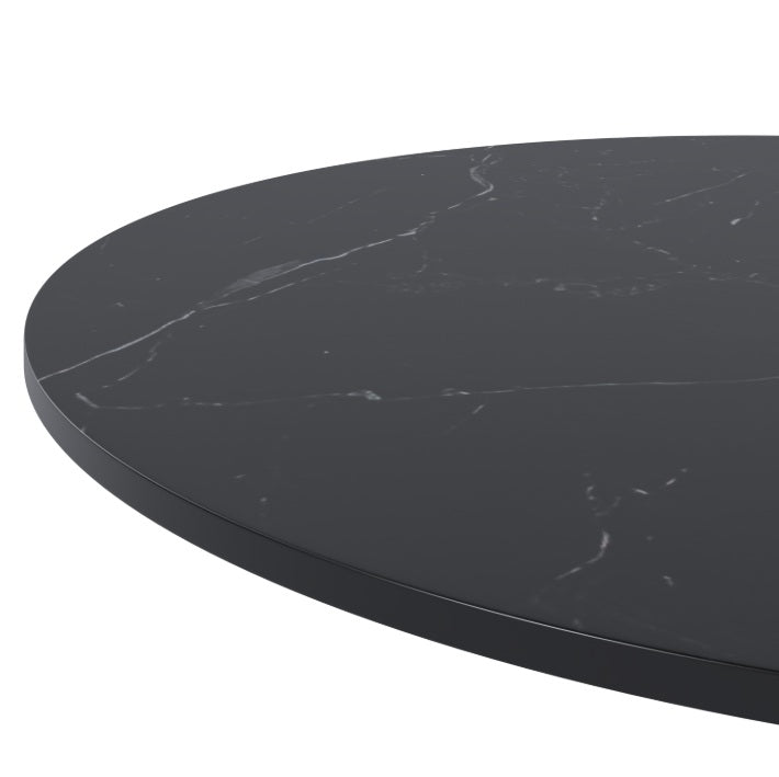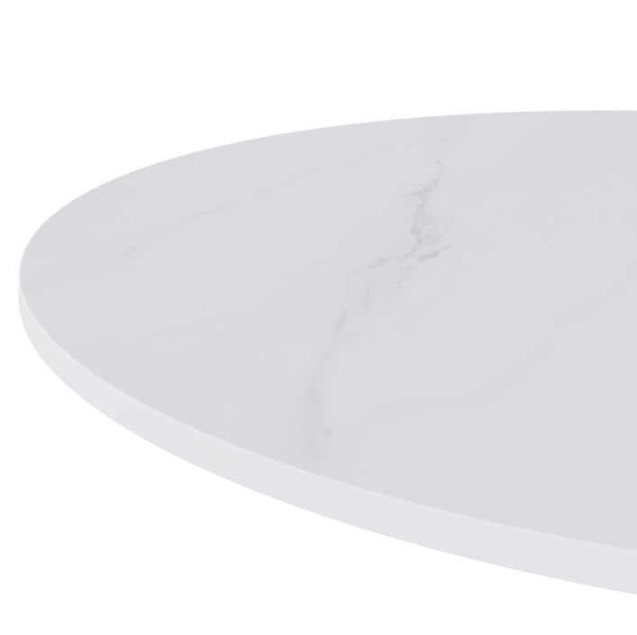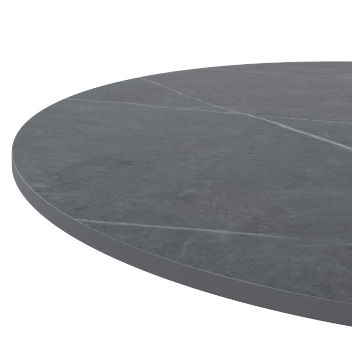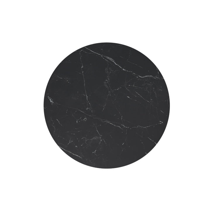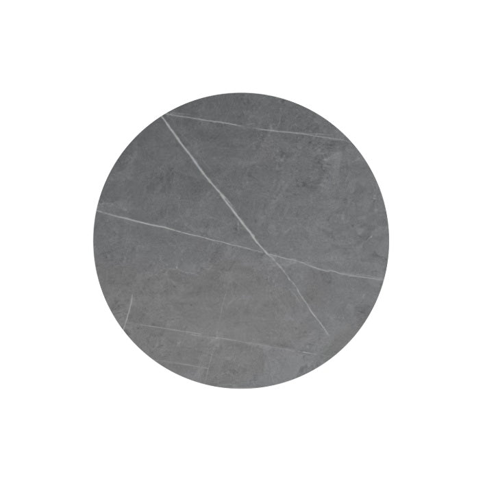 Blatul său rotund din porțelan, cu diametrul de 70 cm și grosimea de 12 mm, este disponibil în trei tonuri neutre - alb, negru și gri - care îi sporesc caracterul discret și atemporal.