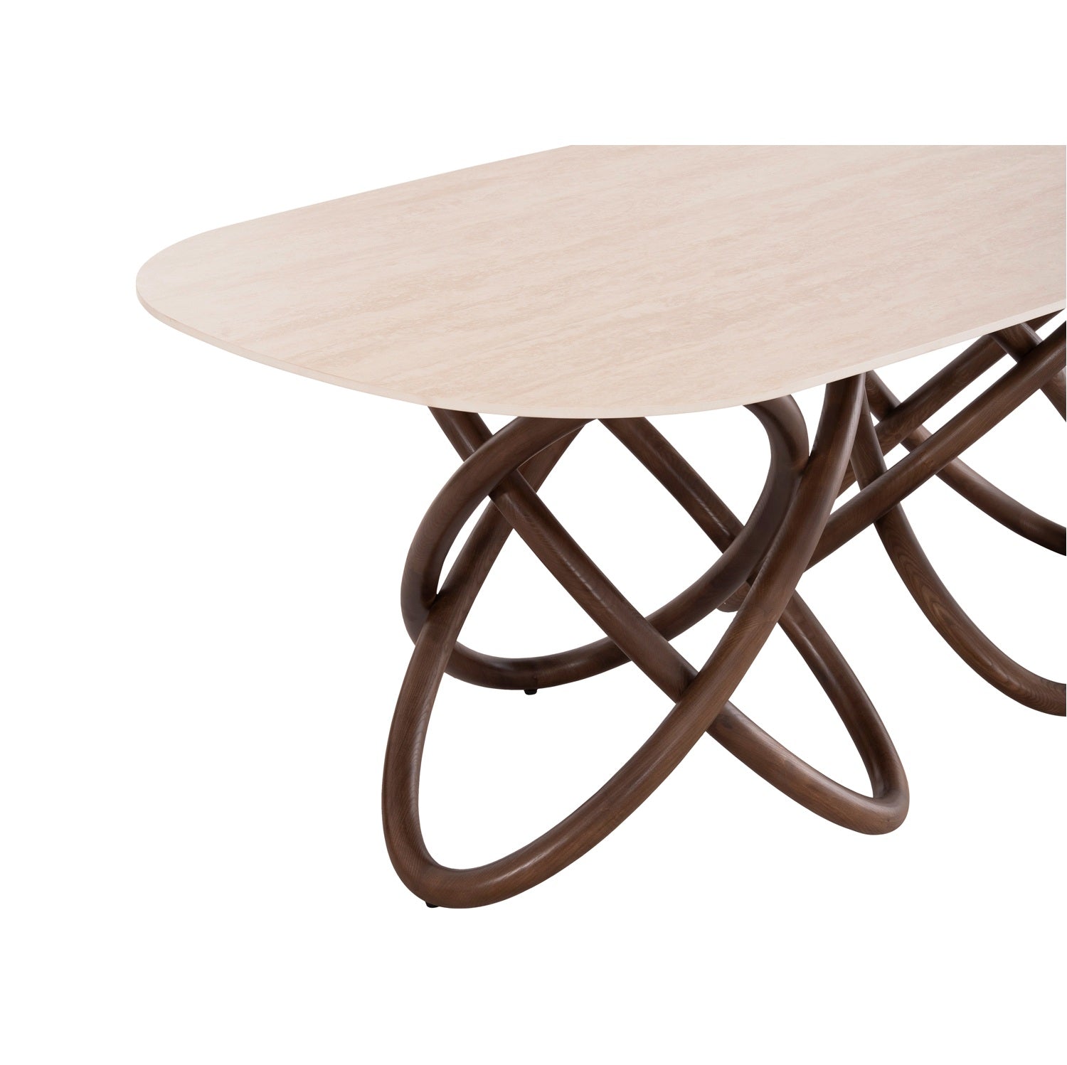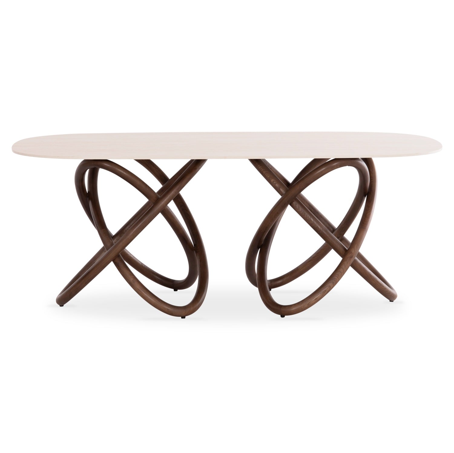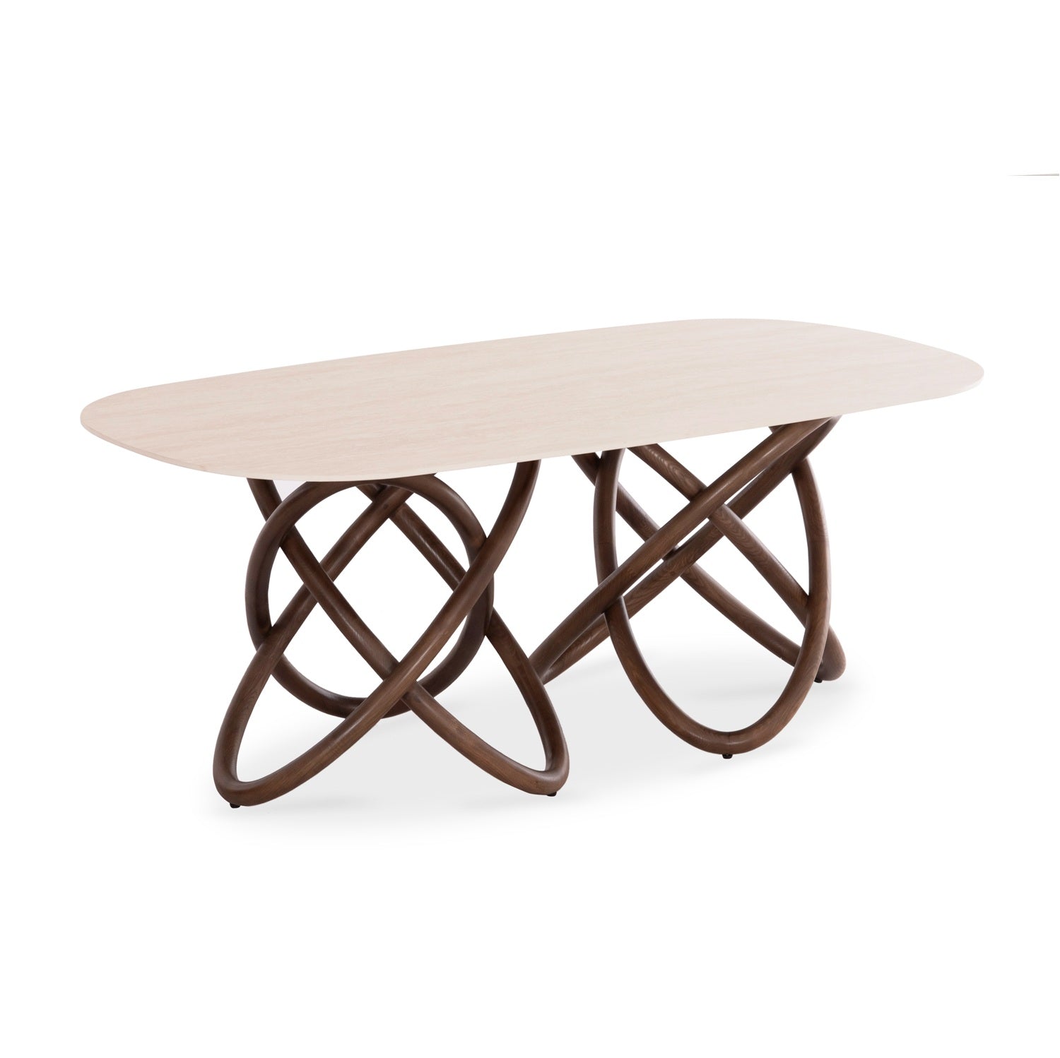 Cu toate acestea, ceea ce atrage atenția sunt picioarele mesei, care sunt realizate din lemn de frasin de culoarea NUC și prezintă un design de inele „orbitante”, care completează imaginea și sporesc luxul evident în fiecare centimetru al acestei mese!