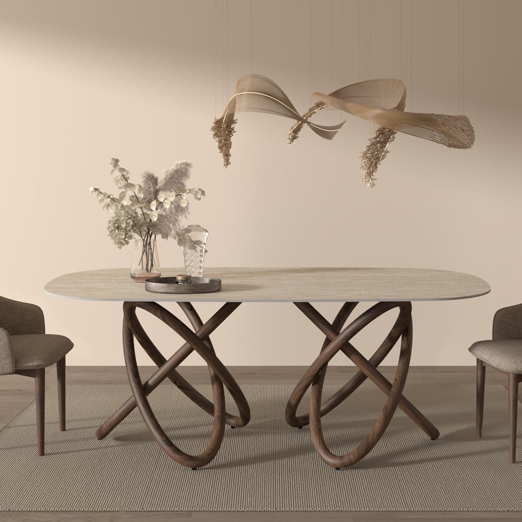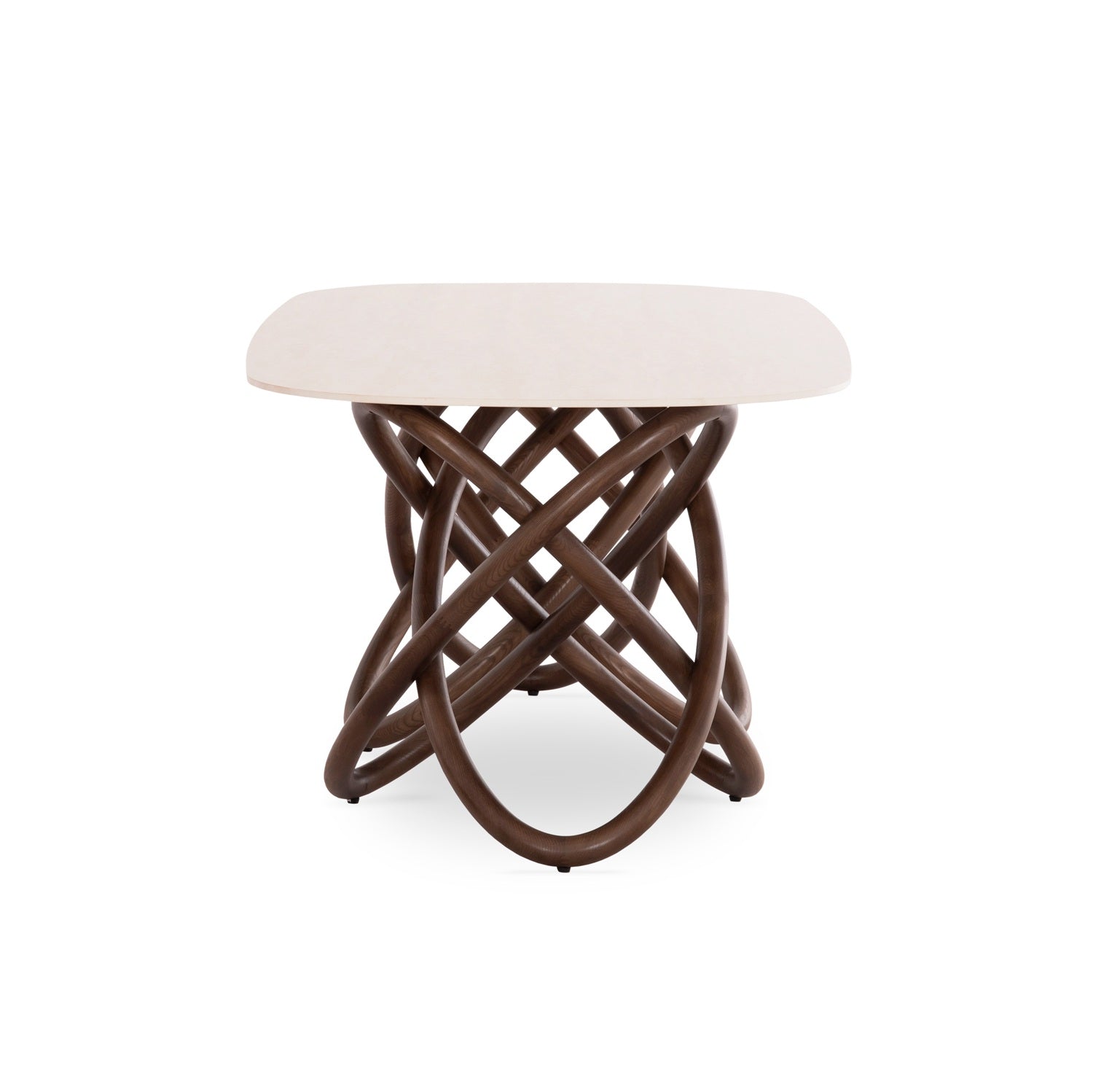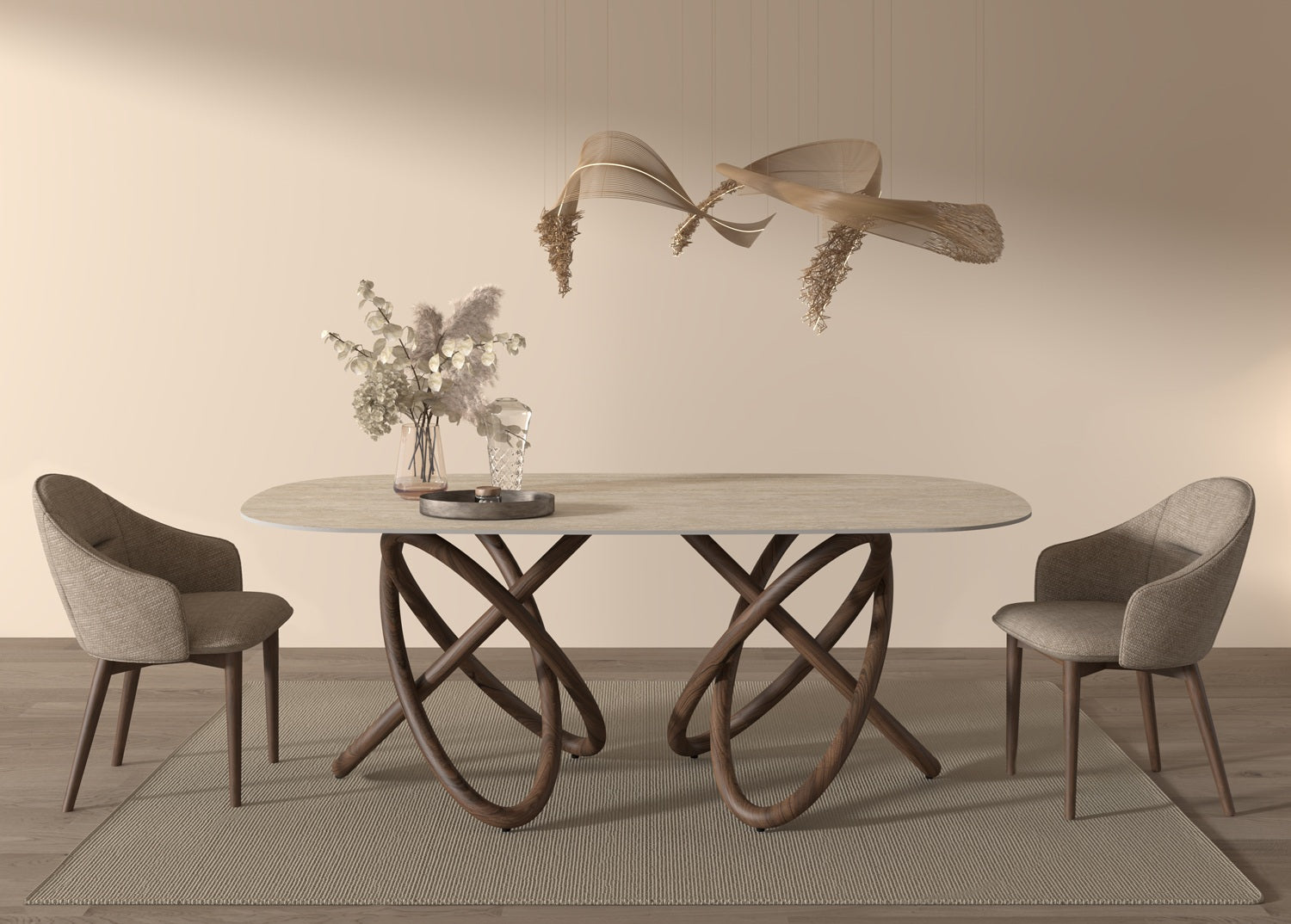 Cu toate acestea, ceea ce atrage atenția sunt picioarele mesei, care sunt realizate din lemn de frasin de culoarea NUC și prezintă un design de inele „orbitante”, care completează imaginea și sporesc luxul evident în fiecare centimetru al acestei mese!