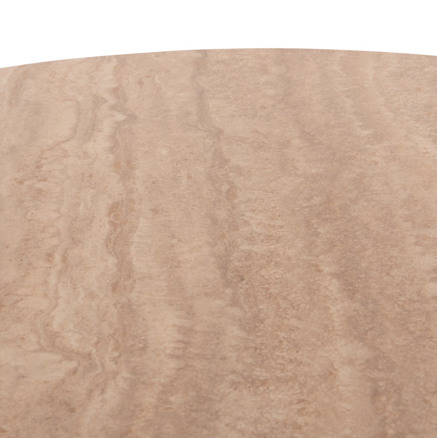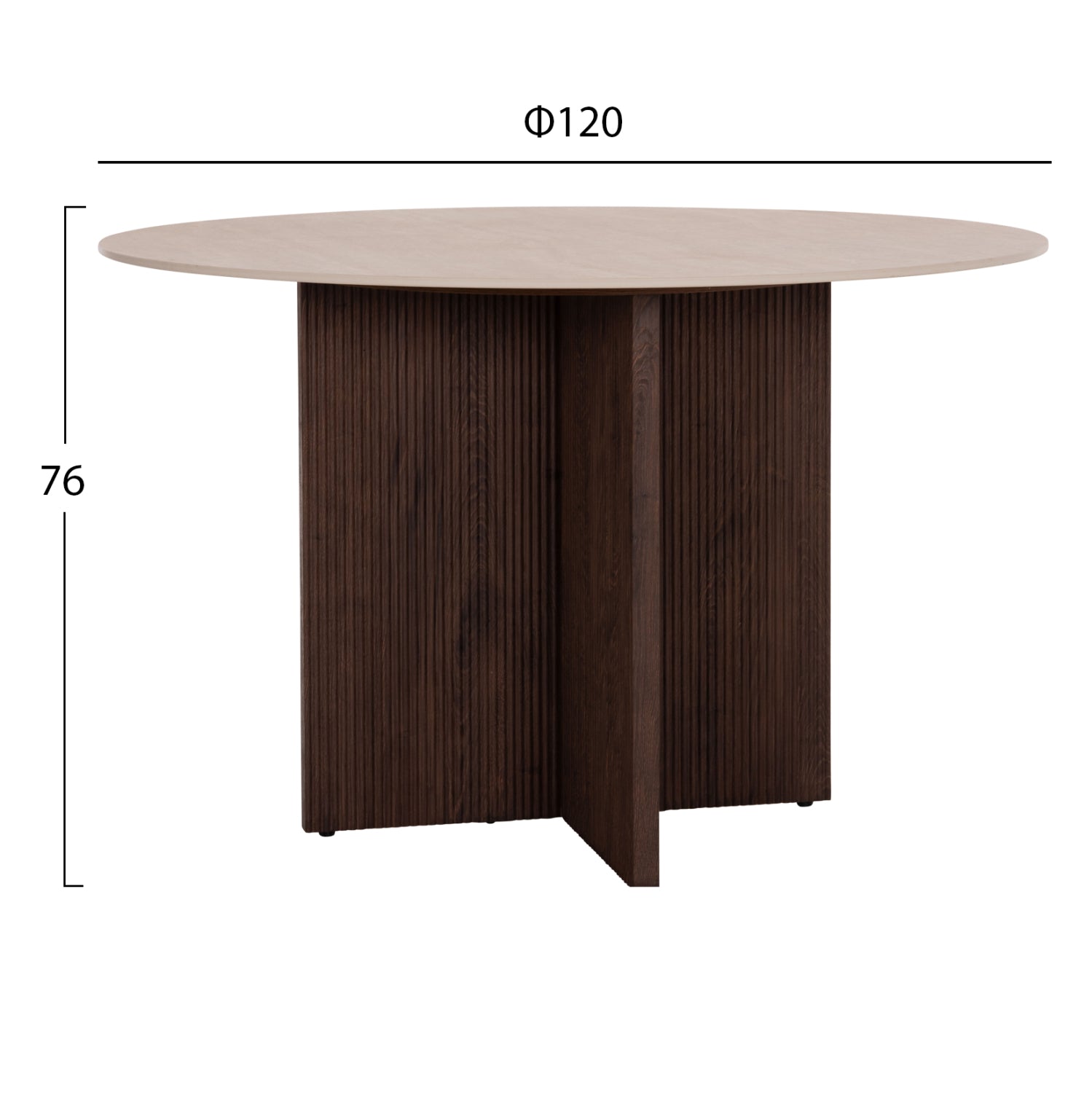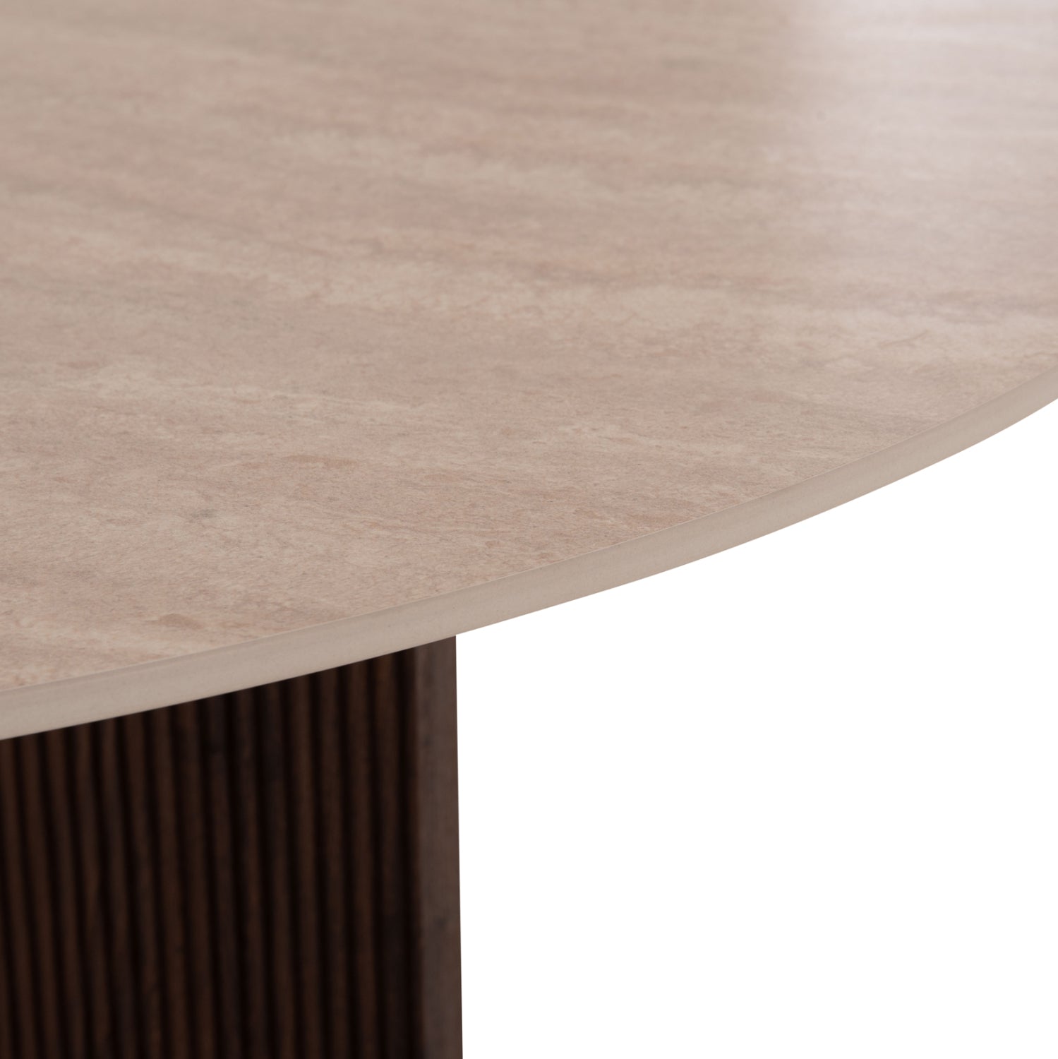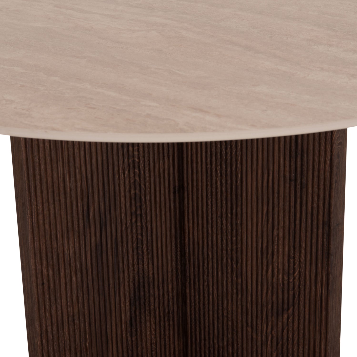 Blatul său plat este din ceramică în culoarea TRAVERTINE STONE, în timp ce baza în formă de cruce este realizată în întregime din MDF în culoarea maro, cu pliuri frumoase.