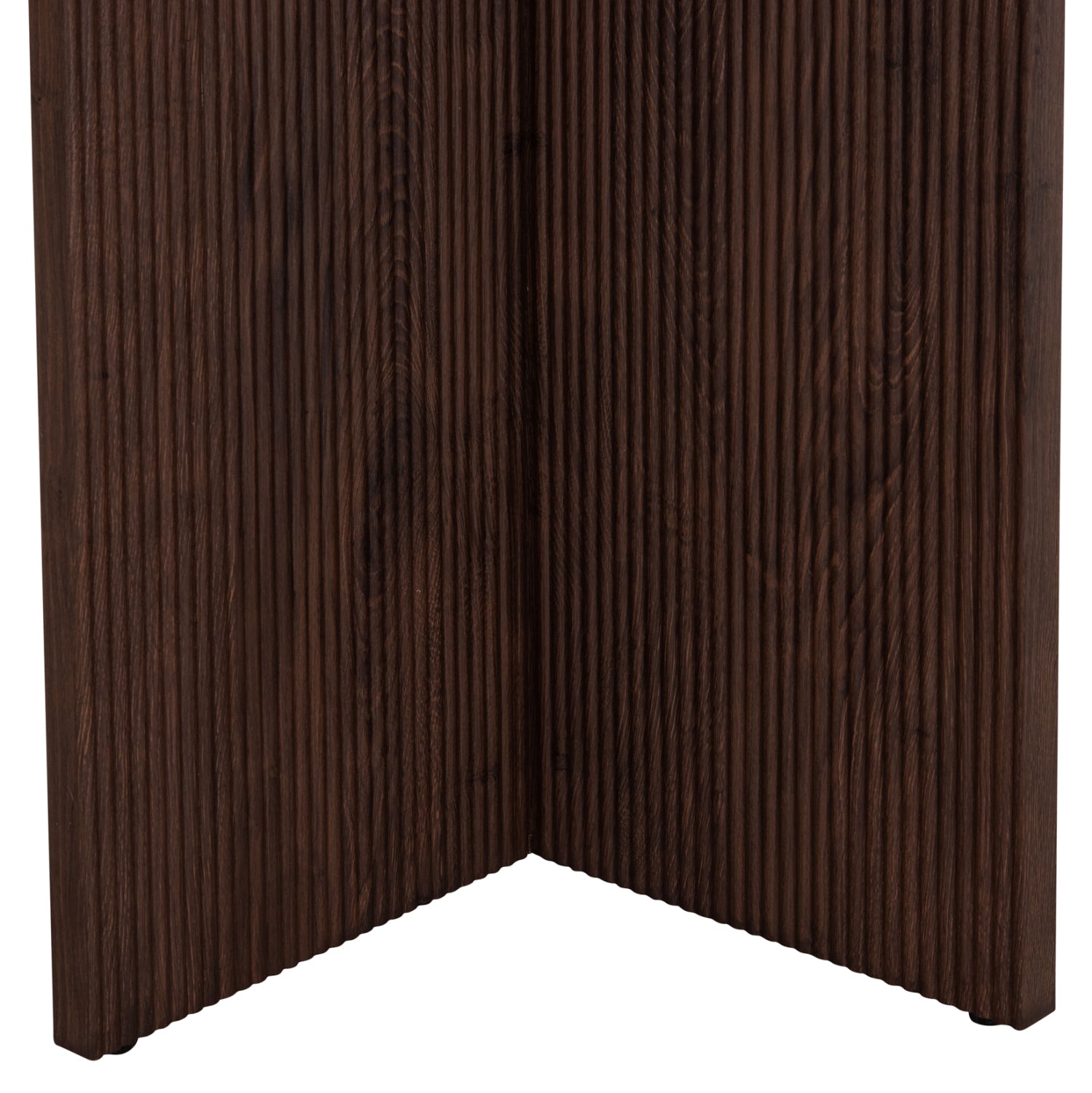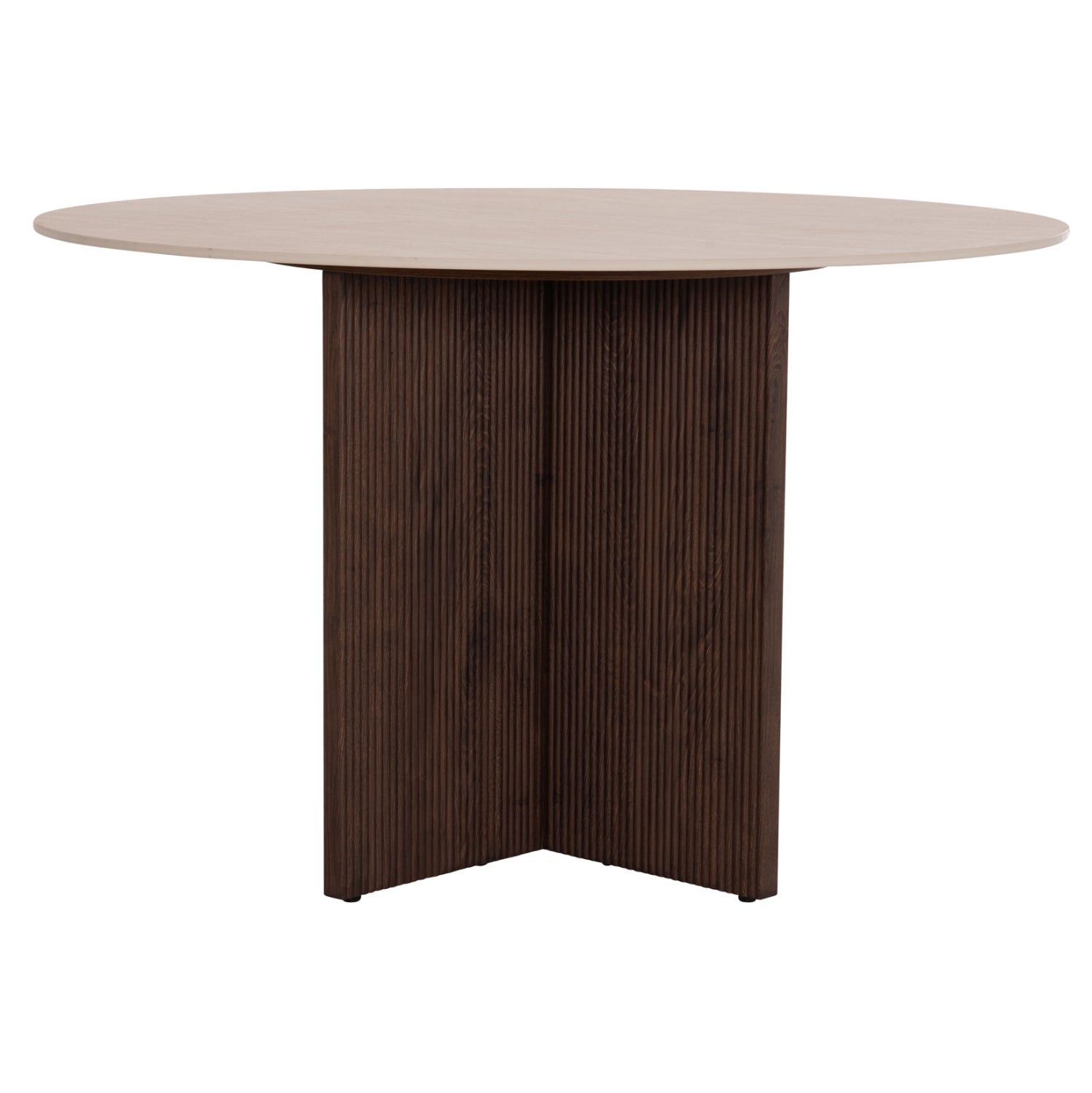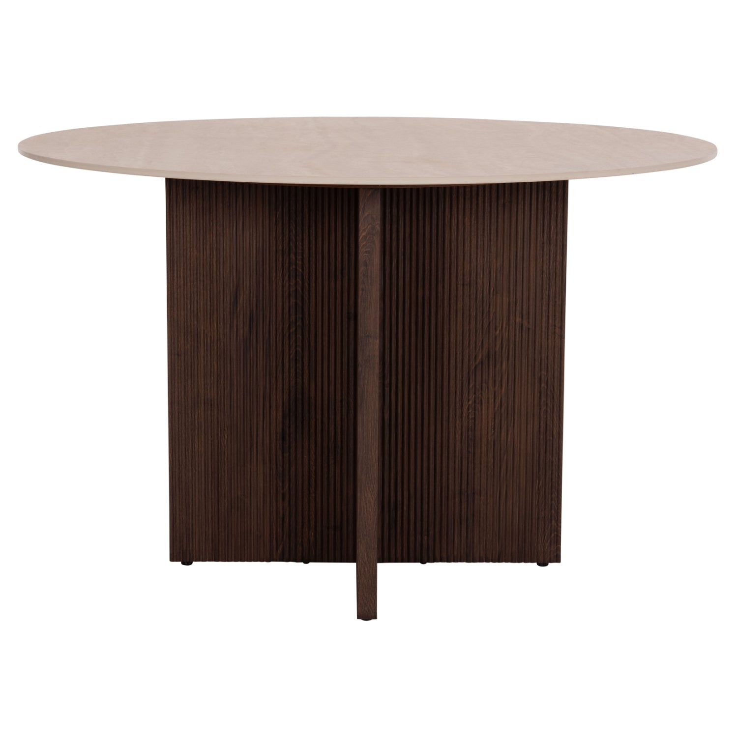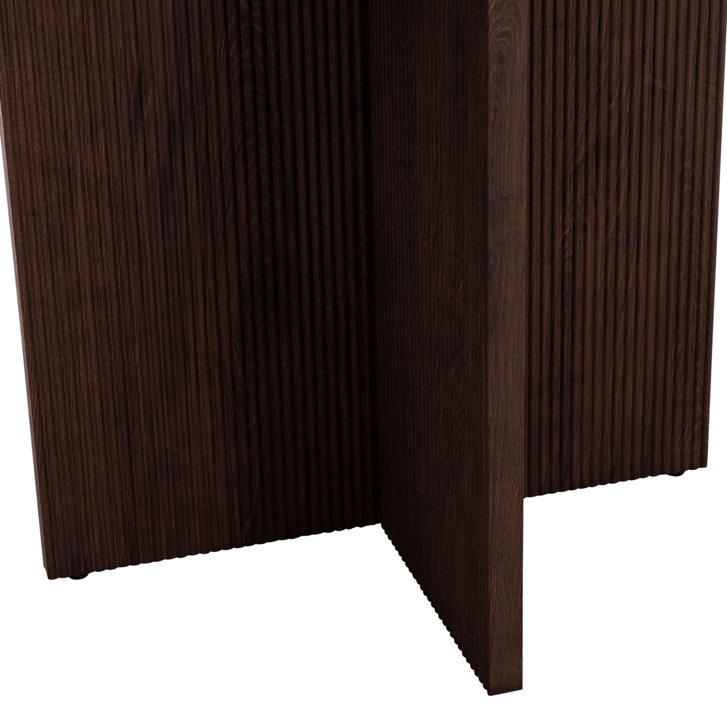 Blatul său plat este din ceramică în culoarea TRAVERTINE STONE, în timp ce baza în formă de cruce este realizată în întregime din MDF în culoarea maro, cu pliuri frumoase.