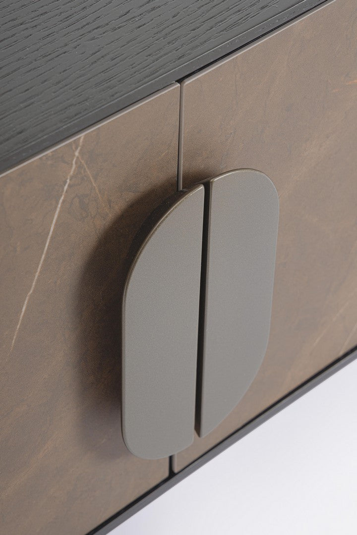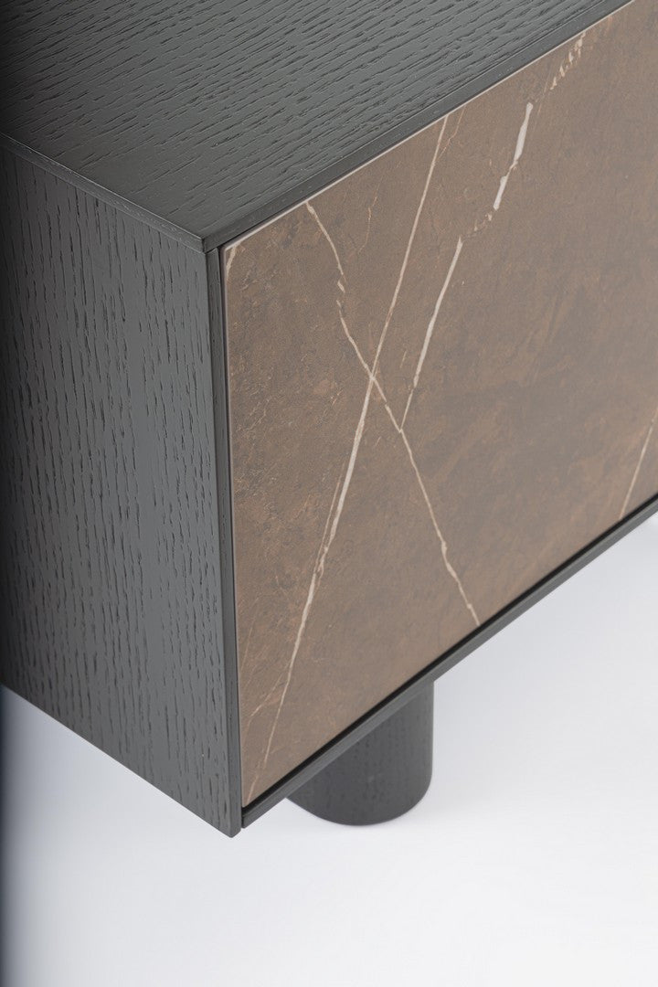 Comoda cu structura si picioare din MDF, furniruit cu lemn de stejar. Finisaj cu vopsea poliuretanica. Usa frontala din ceramica. Manere din MDF. Usi cu balamale cu inchidere usoara.