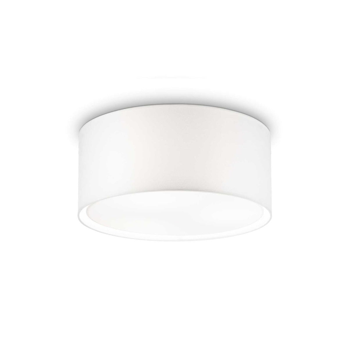 Plafoniera cu baza si structura din metal emailat, abajur din folie PVC ignifuga, acoperita cu material textil.
