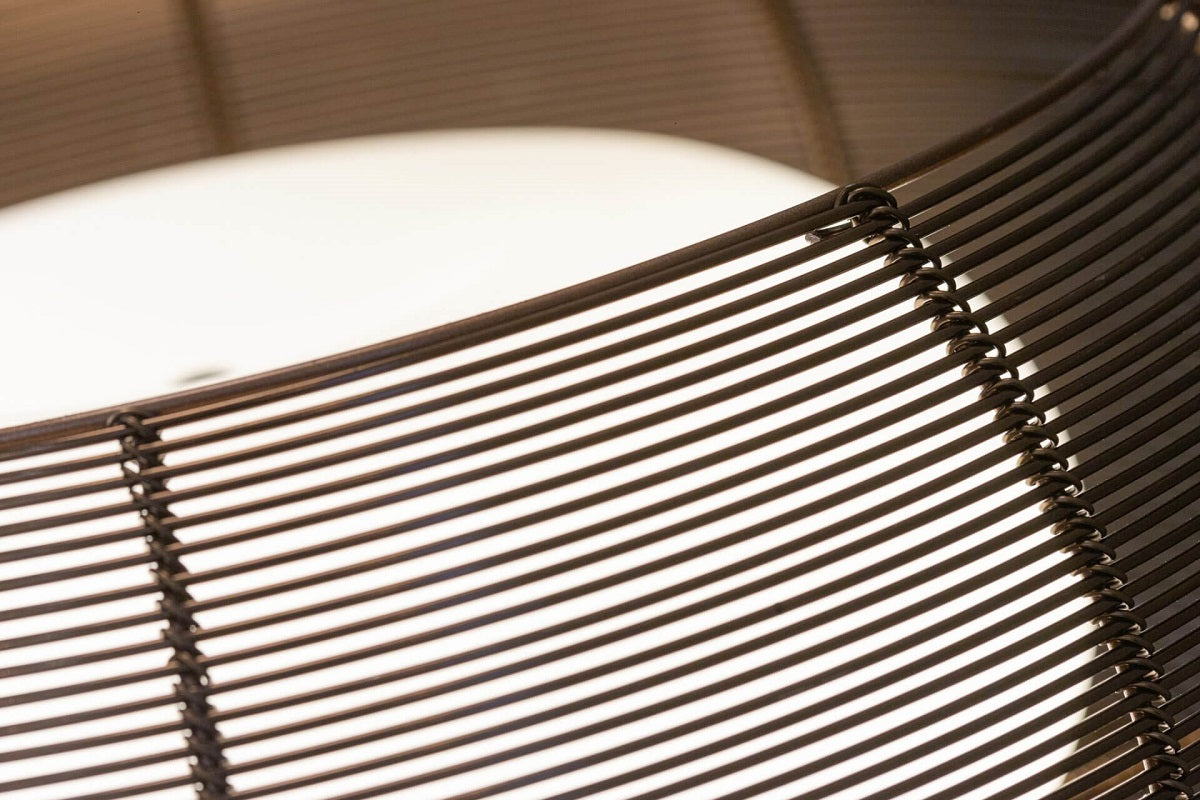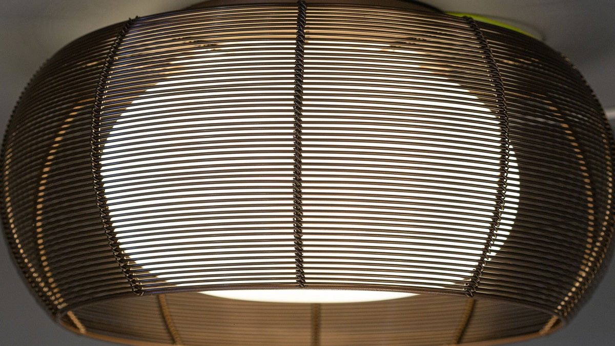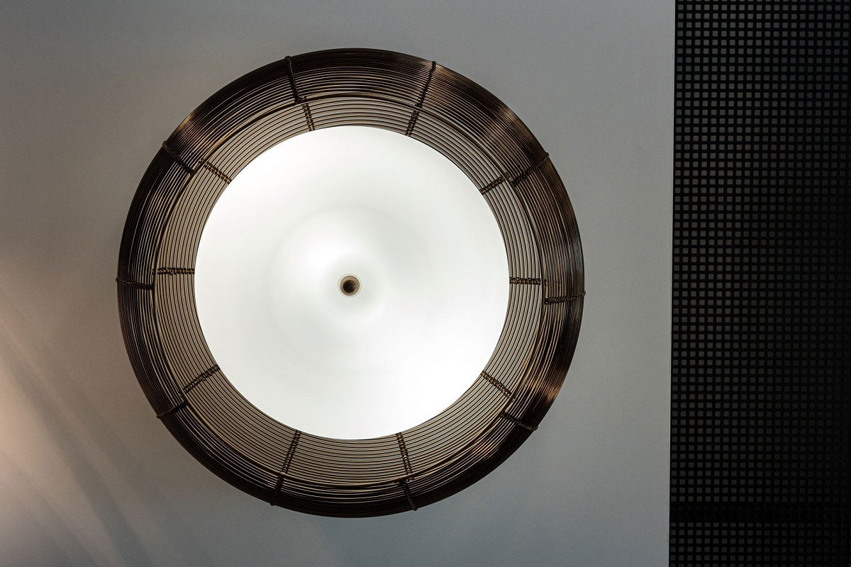 Plafoniera cu abajur realizat din sarme metalice sudate impreuna cu interior din sticla opaca alba. Contine 2 surse de iluminat tip E27.