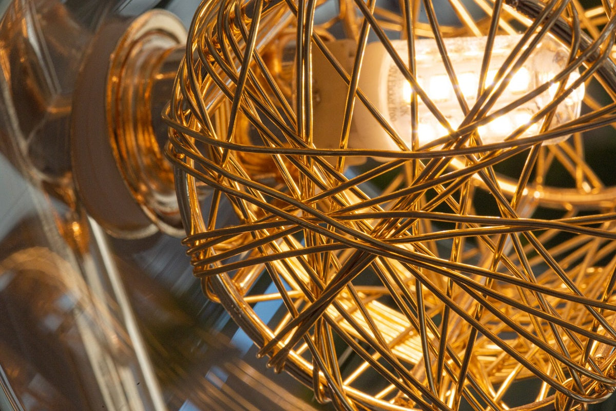 Plafoniera cu 5 abajururi din sticla transparenta si cu elemente din metal. Cadru si prindere de tavan din metal.