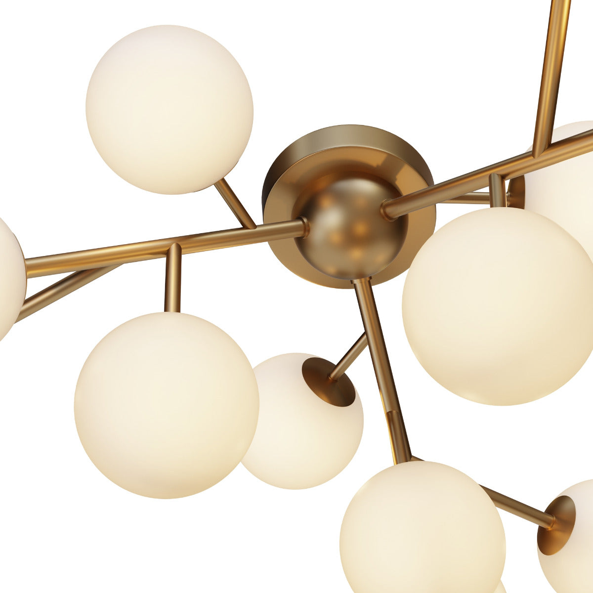 Plafoniera cu brate si suport de tavan din metal vopsit cu abajururi din sticla cu o sursa de iluminat fiecare.