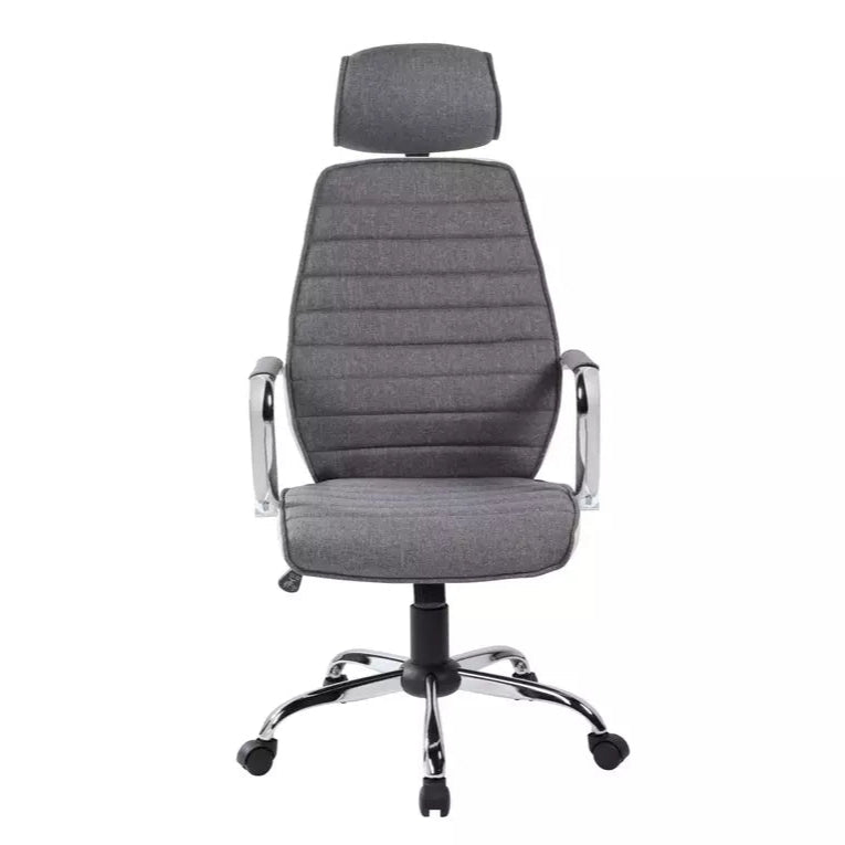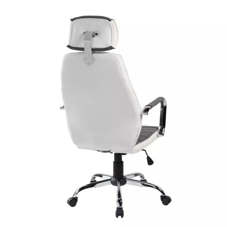 Piele ecologică pe marginile șezutului și spătarului, iar materialul textil în zona de ședere. Picioare și sprijine pentru brațe din aluminiu finisat lucios. Sprijinele pentru brațe acoperite cu material textil pentru confort extra. Role din material plastic rezistent.