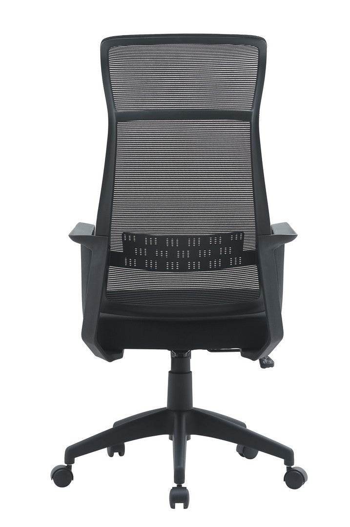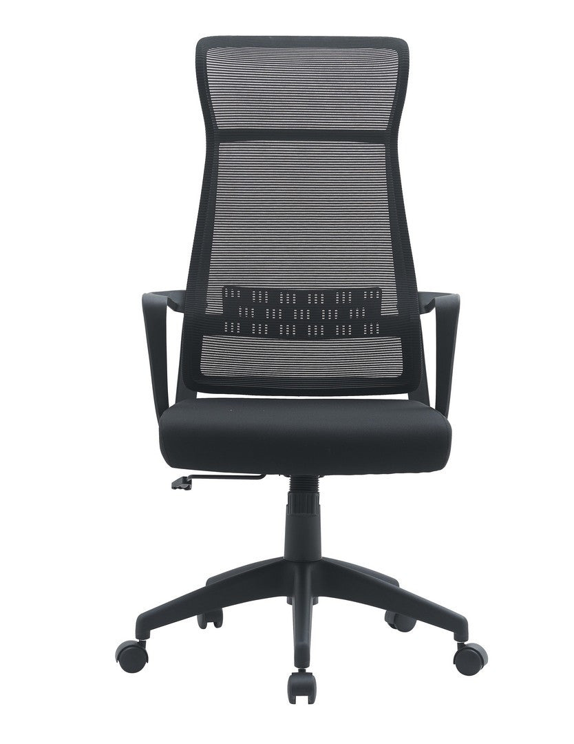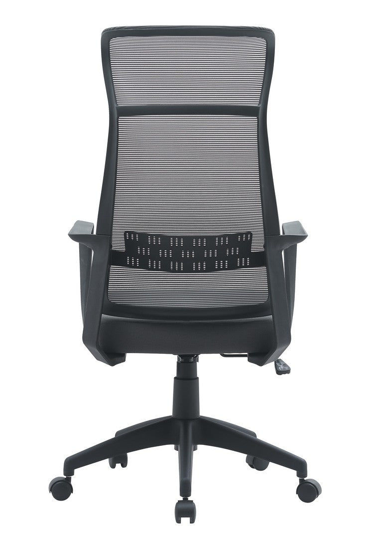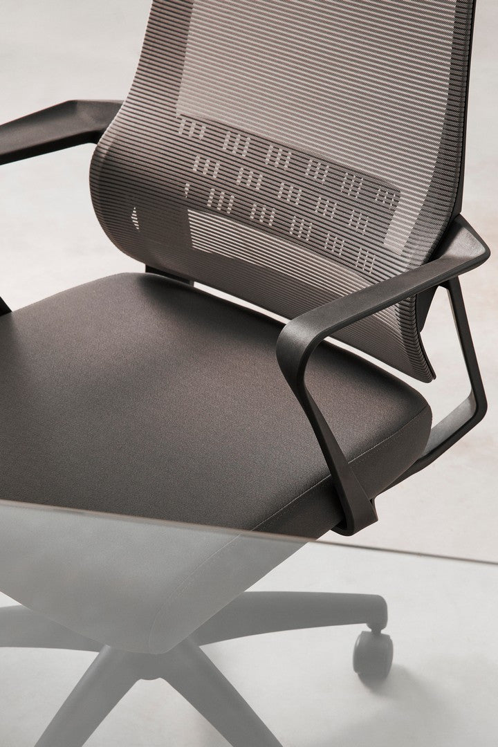 Scaun de birou cu baza de 68 cm, roti din nailon, sezut din placaj, umplutura din spuma poliuretanica ( 25 kg/m3 densitate), tapiterie 100% poliester, spatar si tetiera din plastic PP acoperit cu plasa cu suport lombar. Cotiere pliabile din plastic PP. Reglarea inaltimii cu piston de gaz.