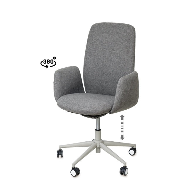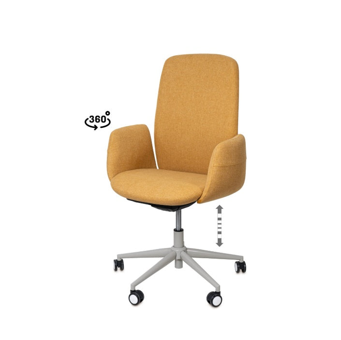 Rotire la 360°, sistem de reglare a inaltimii cu actionare pe gaz, blocare in 2 pozitii a spatarului.