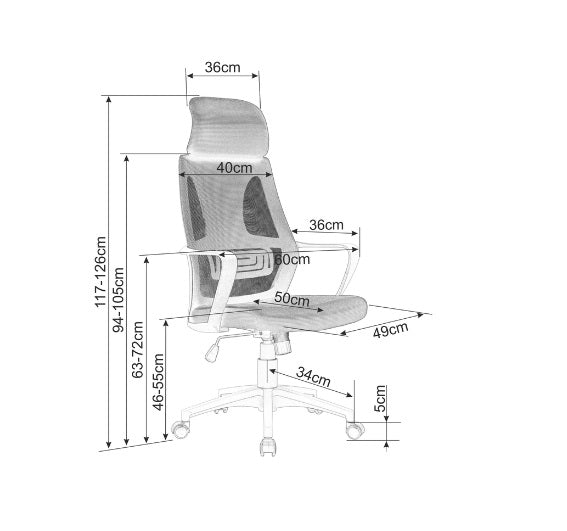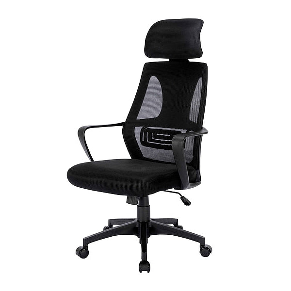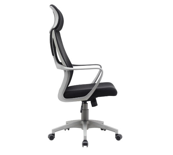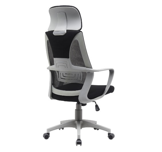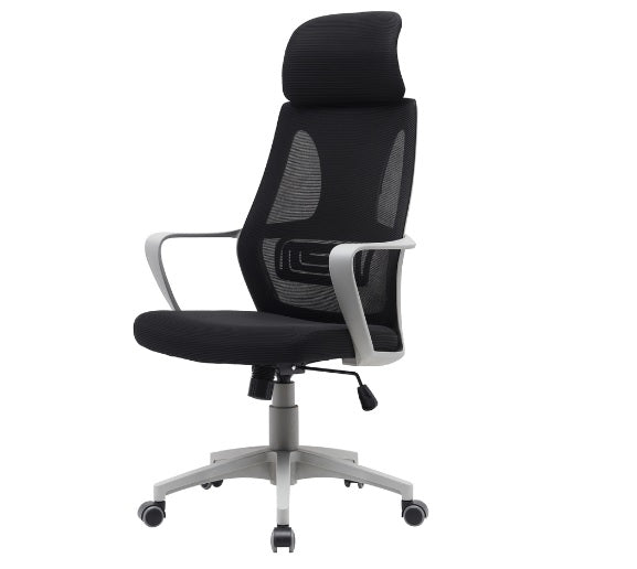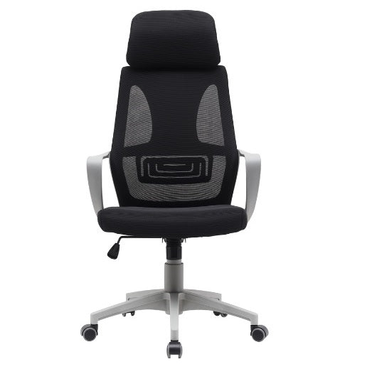 Scaun pivotant, tesatura membrana / plasa, negru, cadru: gri, mecanism TILT, cotiere si tetiere fixe, roti cauciuc, sarcina maxima 120 kg.