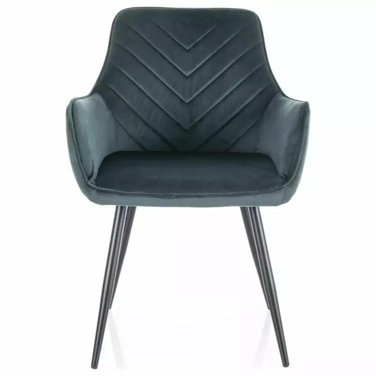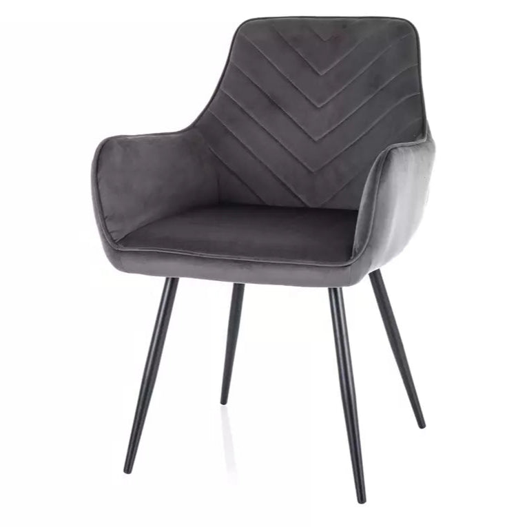 Scaun modern cu tapiterie din tesatura Bluvel, cadru din metal negru mat.