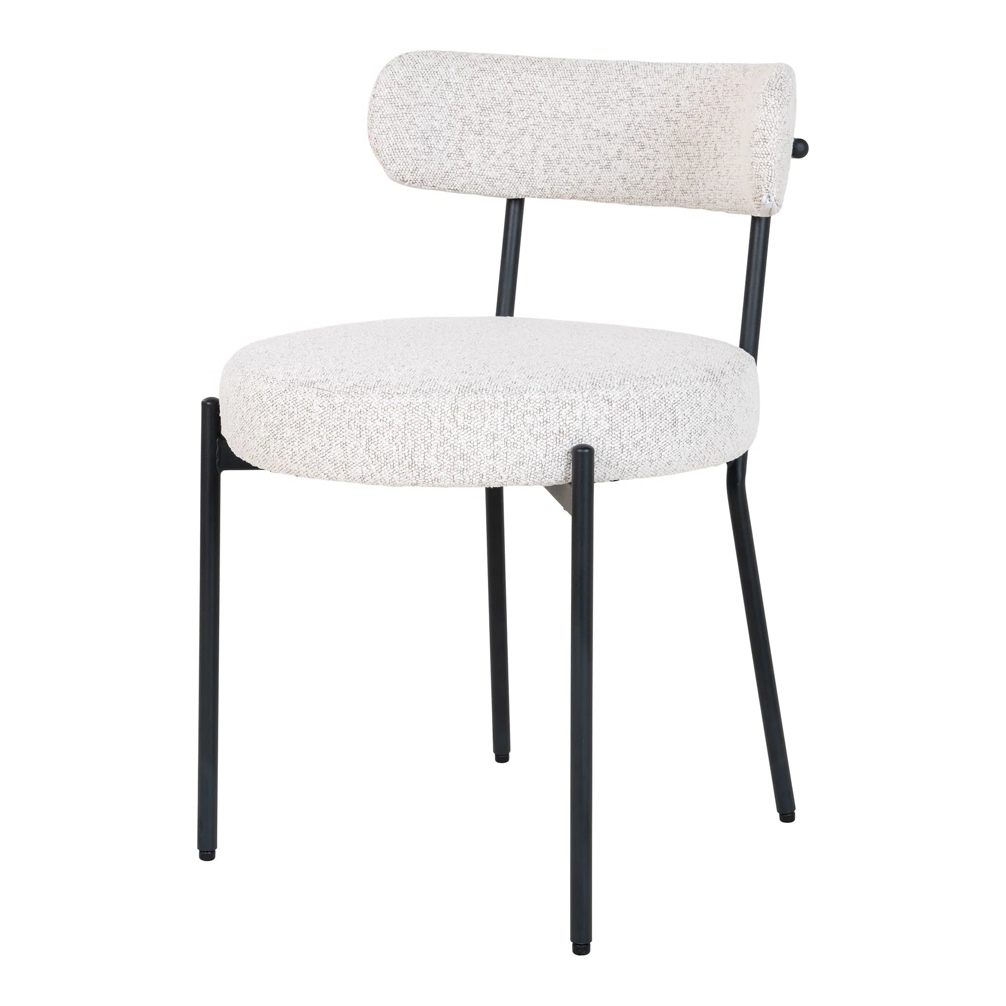 Scaun cu structura din metal (otel), placaj si tapitat cu material textil poliester 100% (boucle), umplutura spuma poliuretan cu densitate 28 kg/m3.