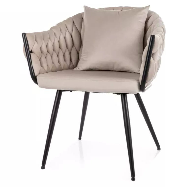 Scaun modern tapitat cu țesătură de catifea. Picioare metalice cu finisaj negru mat.
