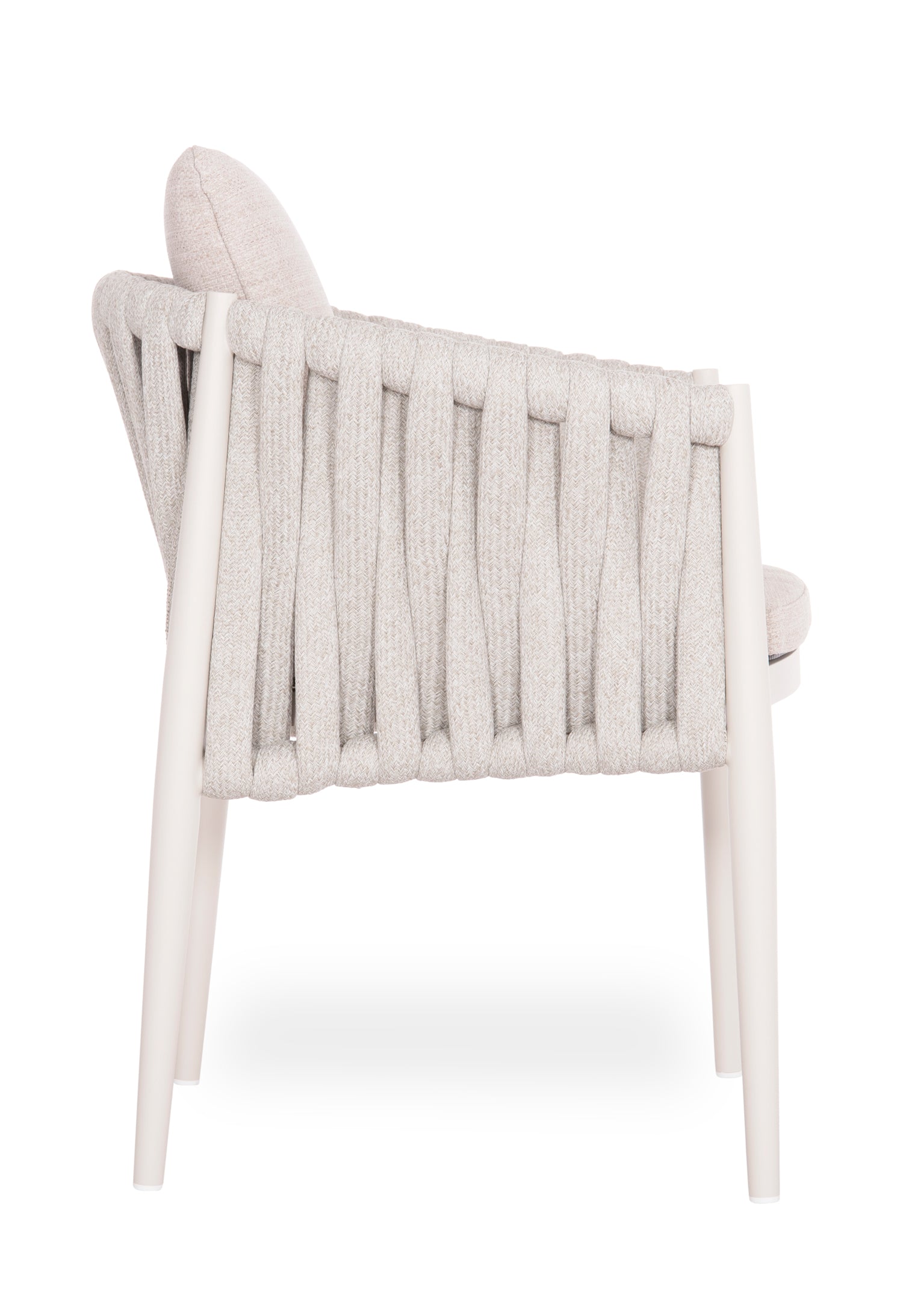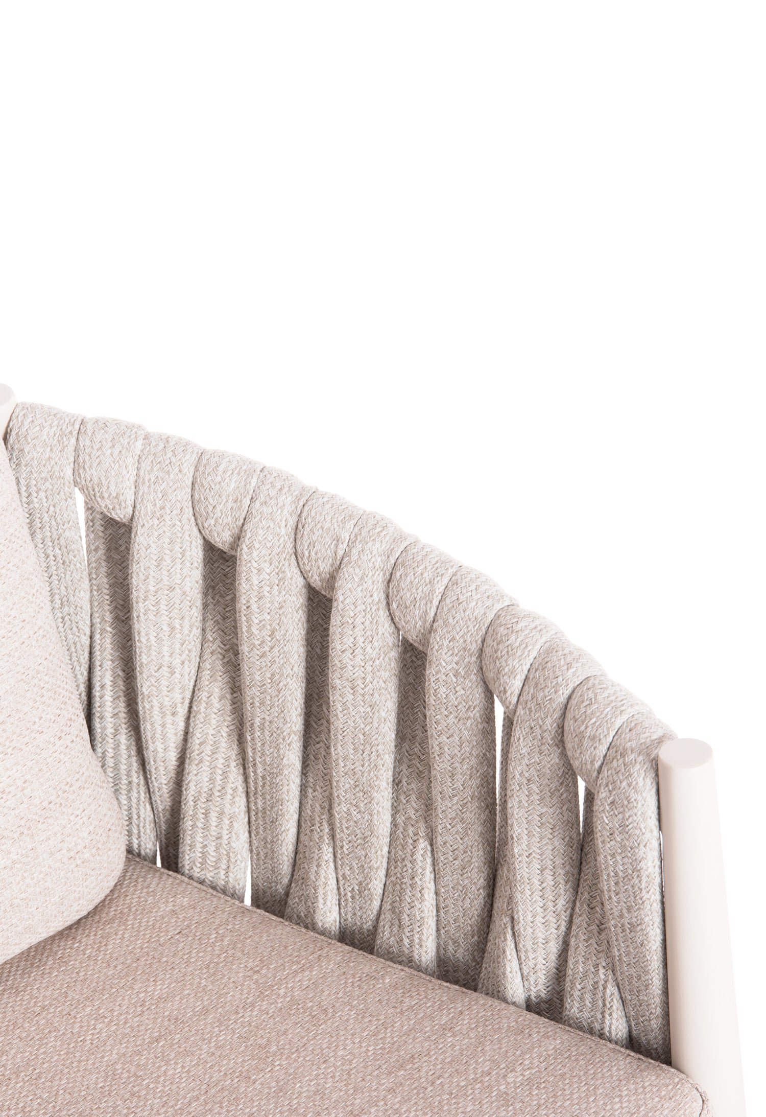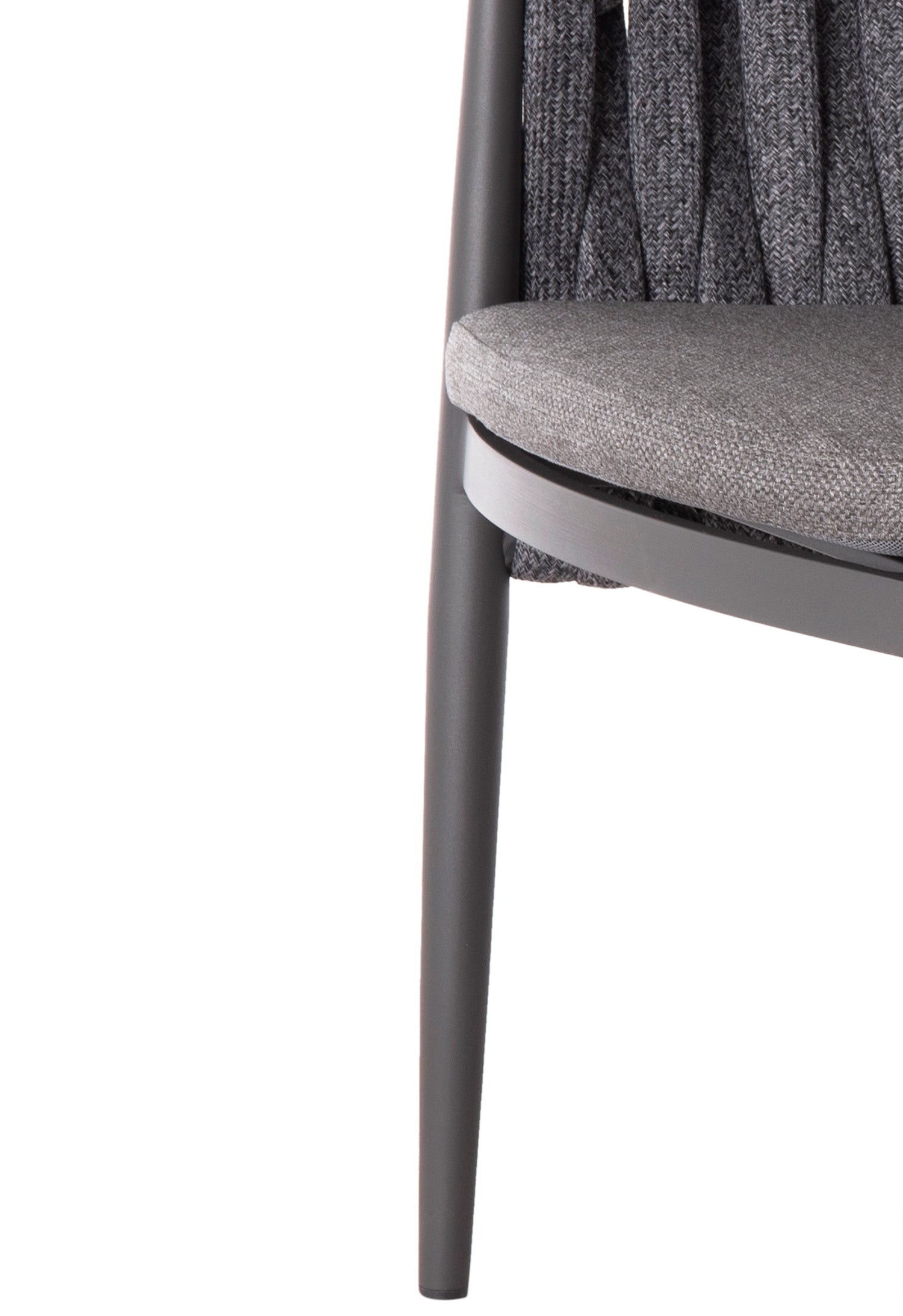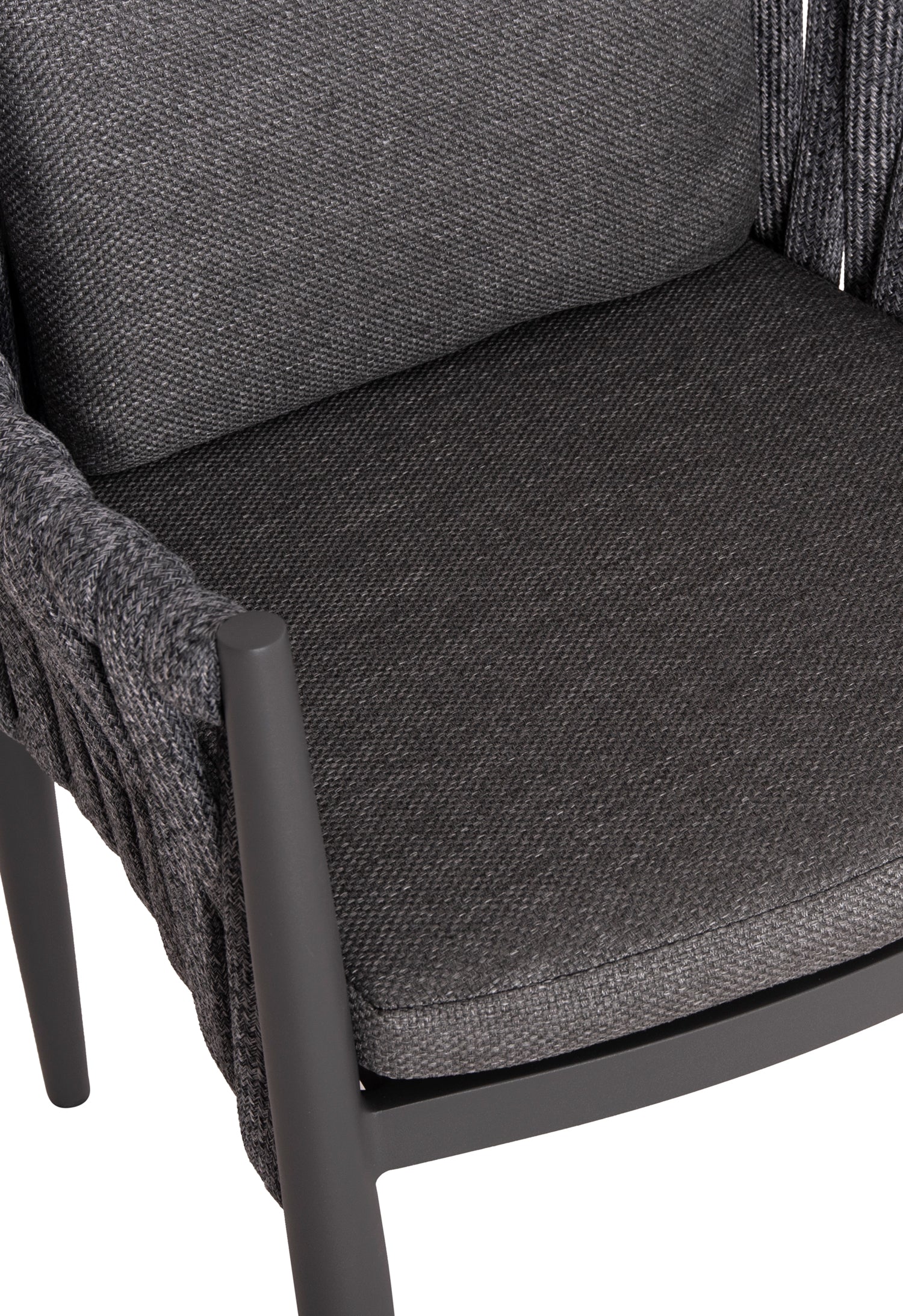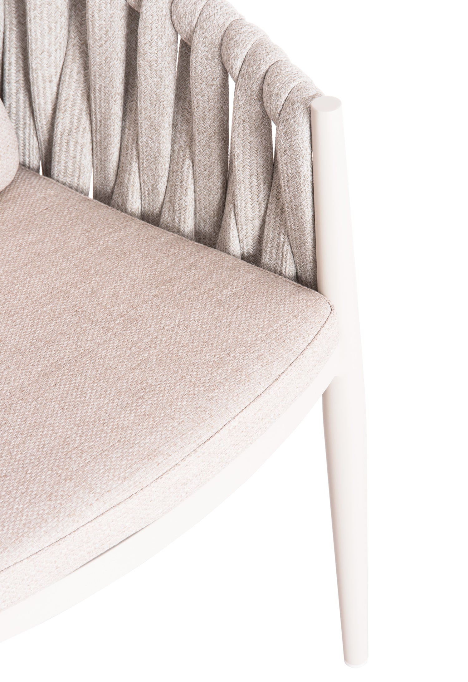 Fabricat din aluminiu și frânghie cu curea lată din poliester ca o căptușeală pe spătarul semicircular, acesta emană lux și confort. Îmbrăcămintea pernelor este din țesătură OLEFIN, care este hidrofugă și durabilă.