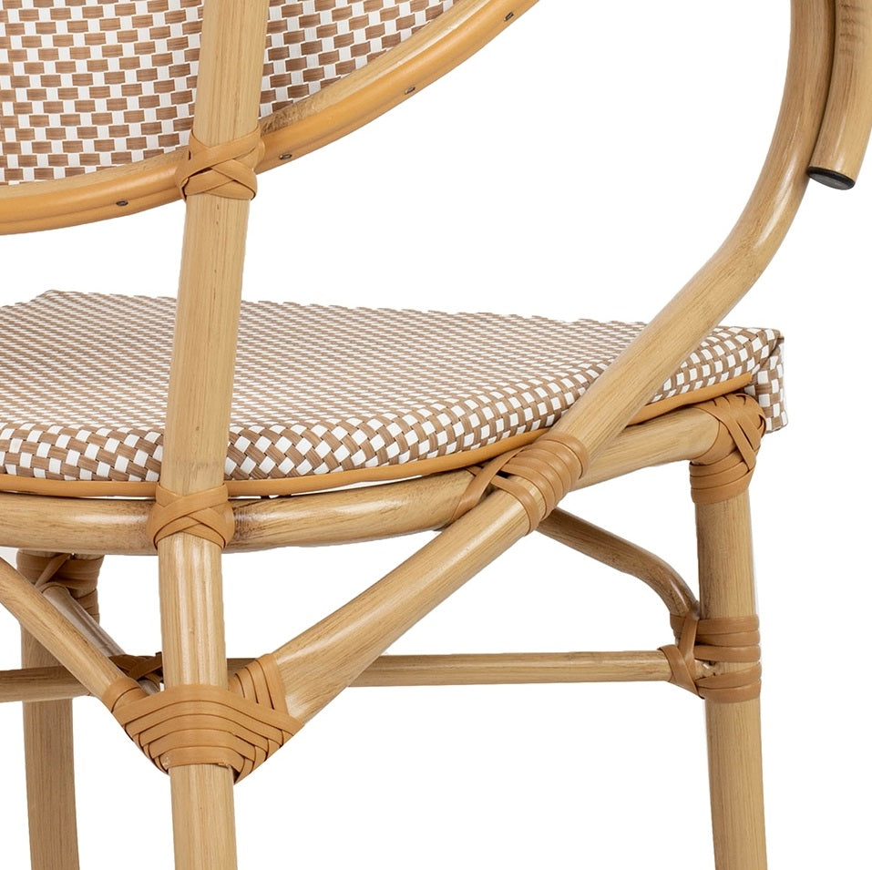Scaunul confortabil cu cotiere este realizat din aluminiu, otel si ratan sintetic in culori maro deschis.