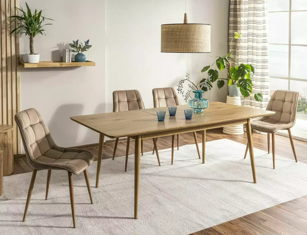 Scaun modern tapitat cu material textil tip catifea si picioare din metal culoarea stejarului.