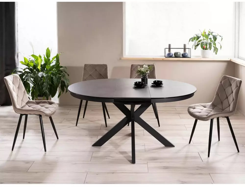 Scaun modern tapitat cu tesatura catifea si picioare din metal negru mat.